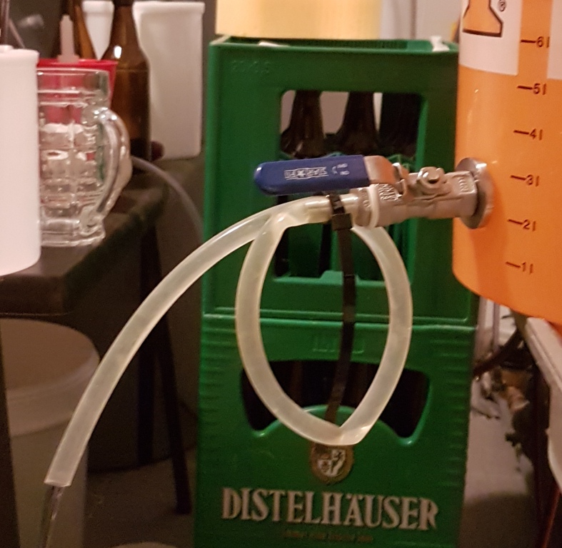 Sollte wenn du ein U einbaust, hinter dem U sein. Die Richtung des Abgangs ist dem Druck ziemlich egal, ich habe den direkt nach oben gemacht. Pass aber auf beim vorschiessen! Mach den dafür am besten zu, da du dir ansonsten damit Luft reinziehen kannst (öffnen), oder die Würze nach oben rausschiesst. (schliessen)