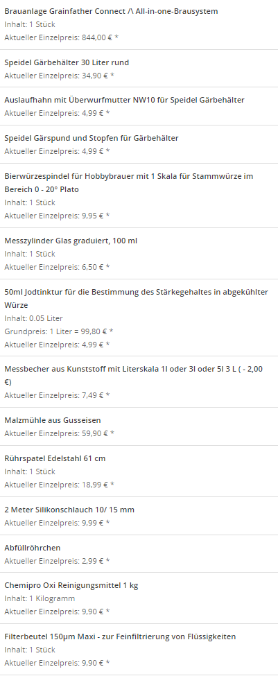 Bei einem in Dresden ansässigen Online-Shop habe ich alles bestellen können was nötig war. Meine Einkaufsliste (exkl. Zutaten, Bügelflaschen, Zucker-Dosierhilfe und StarSan) sah/sieht wie folgt aus.