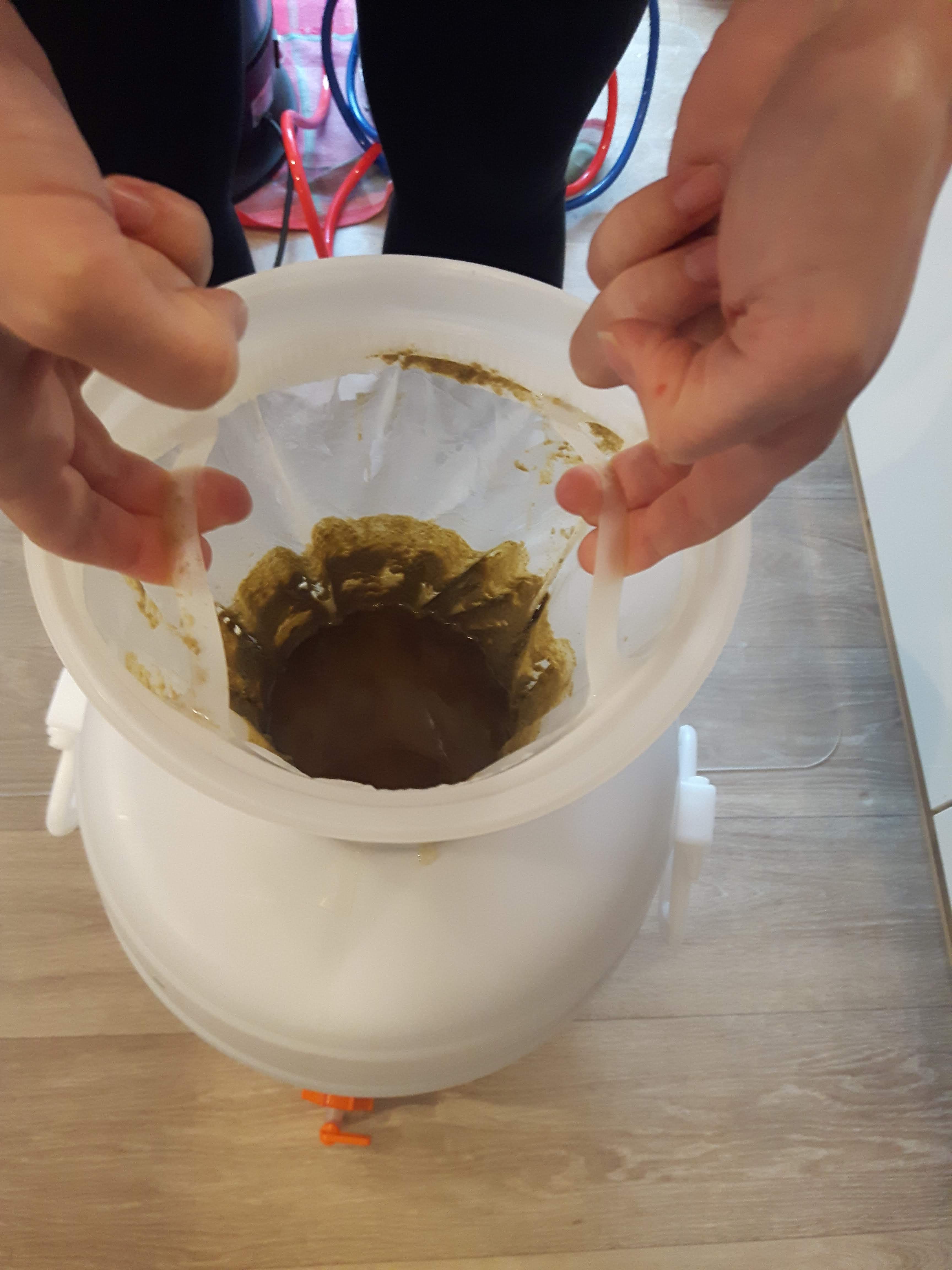 Die Abfüllung gestaltete sich etwas schwierig. Ich habe in das Gärfass einen 150µm Filterbeutel eingelassen und die Ausschlagwürze entsprechend gefiltert. Die Würze lief ab einem bestimmten Zeitpunkt nur sehr schwer durch den Filter, sodass es zu einem Rückstau kam. Ich habe daher den Filterbeutel mit den Händen immer ein Stück weiter nach oben gezogen. Damit war ich bestimmt 20-30 Minuten beschäftigt. Hier ein paar Eindrücke von der Abfüllung ins Gärfass.