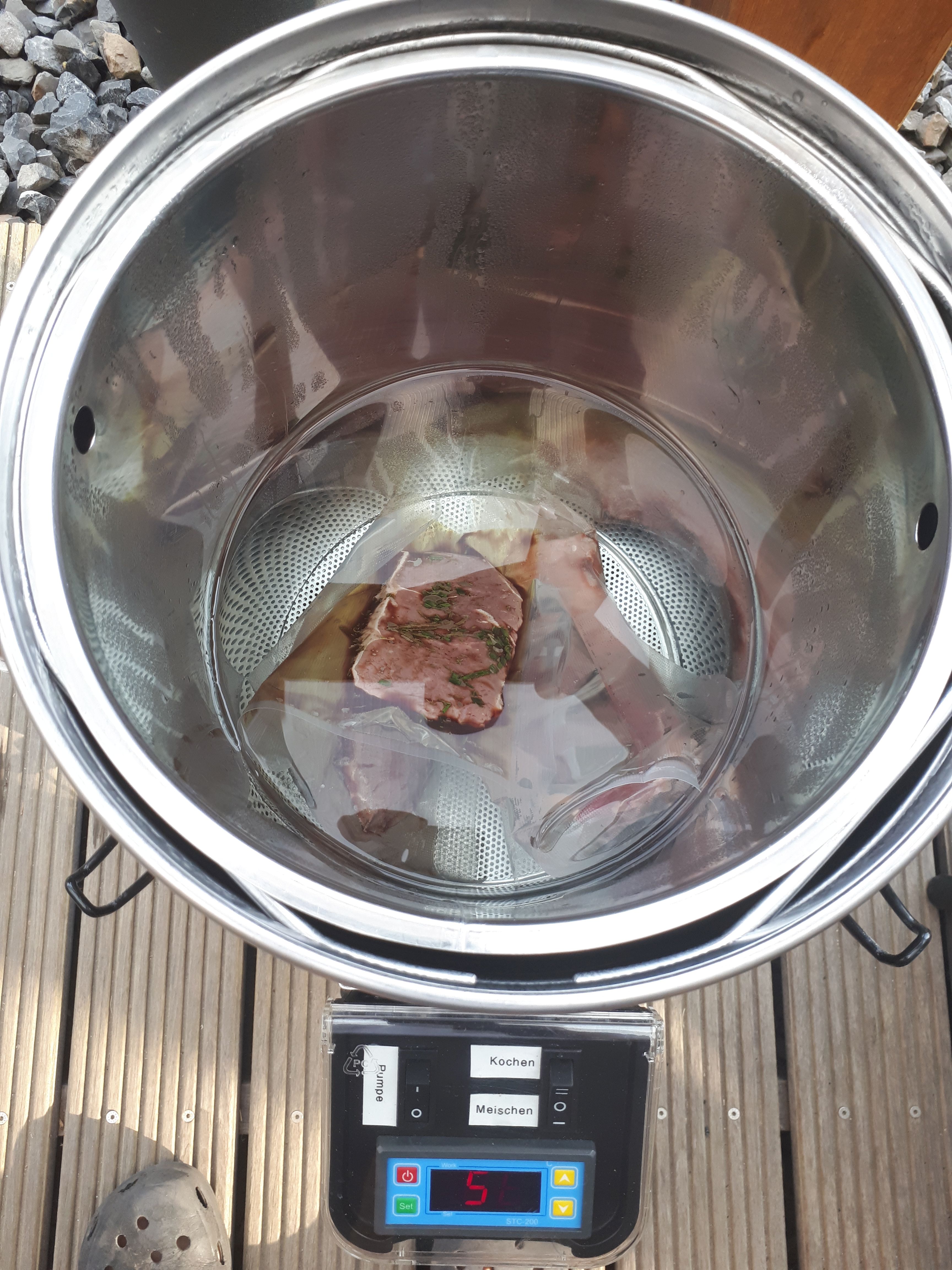 da mir im Moment zu warm zum brauen und sonstiger Betätigung ist, hing ich ein bisschen faul und antriebslos rum. Meiner Frau kam dann auf die Idee die Brauanlage zum Sous-vide zu benutzen und eine Grillabend zu veranstalten.