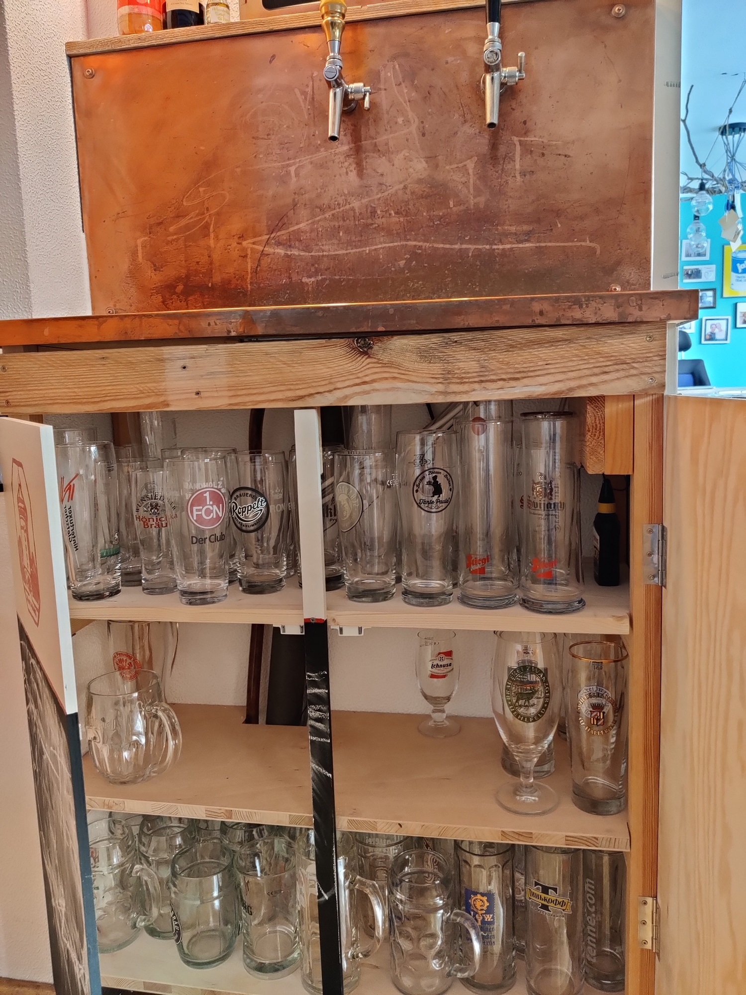 Oben die Tafelwasseranlage, unten der zweileitige Kühler. Oben gehts durch die Decke in den Wohnbereich. Beim Wasser daraus achten, dass der Schlauch dem Druck standhält. Ein normaler Bierschlauch reicht nicht. Vorn steht normalerweise ein Bierfass. Aktuell ist aber dry January ;-)
