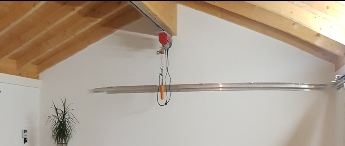 An der Decke hab ich eine Laufschiene mit zwei Laufschlitten (Aluplatte als Adapterstück zwischen Seilwinde und Lautschlitten) montiert.