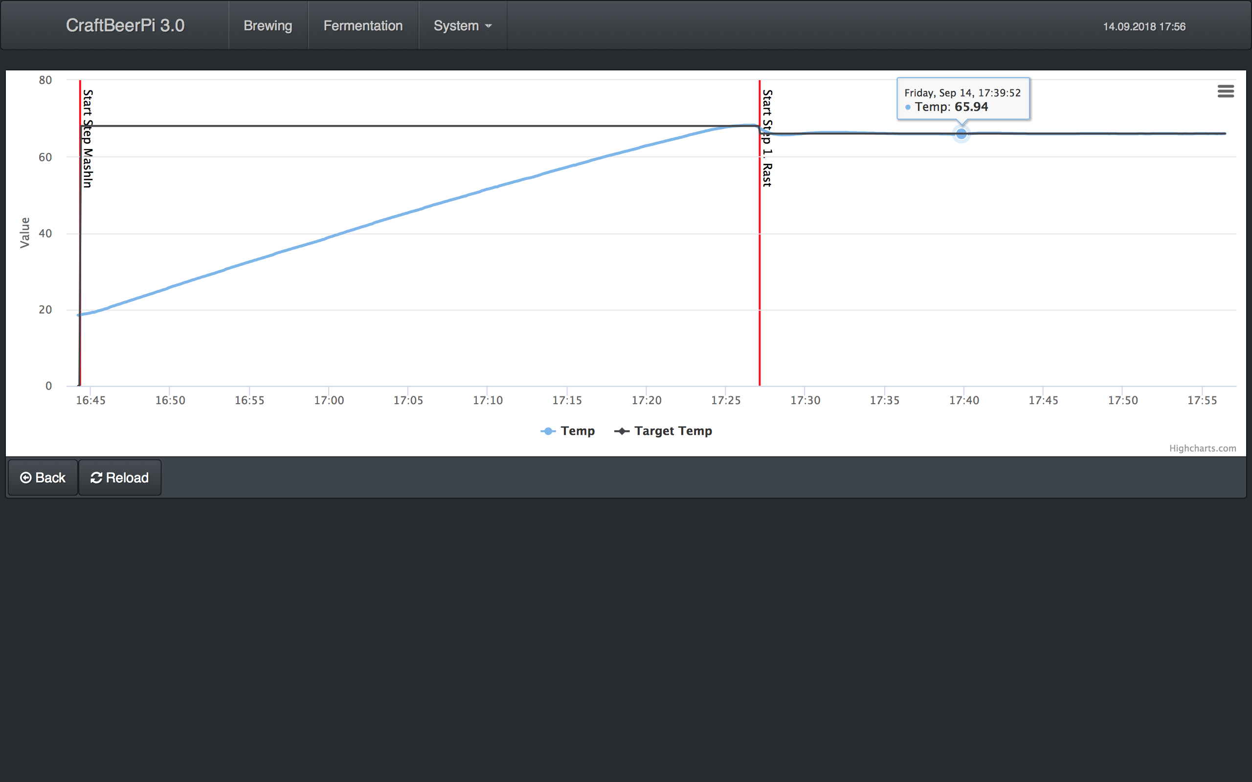 30 Liter Hauptguss einlassen und mit Milchsäure auf dH = 0 eingestellt. und währenddessen 8,75 kg Wiener Malz schroten. Hier nur das Ergebnis: Die Steuerung hat die Temperatur sehr schön reguliert und gehalten, hier mal ein Screenshot von später: Laut Log war der Peak bei 68.25, also nur 0.25° Overshoot - respektabel.