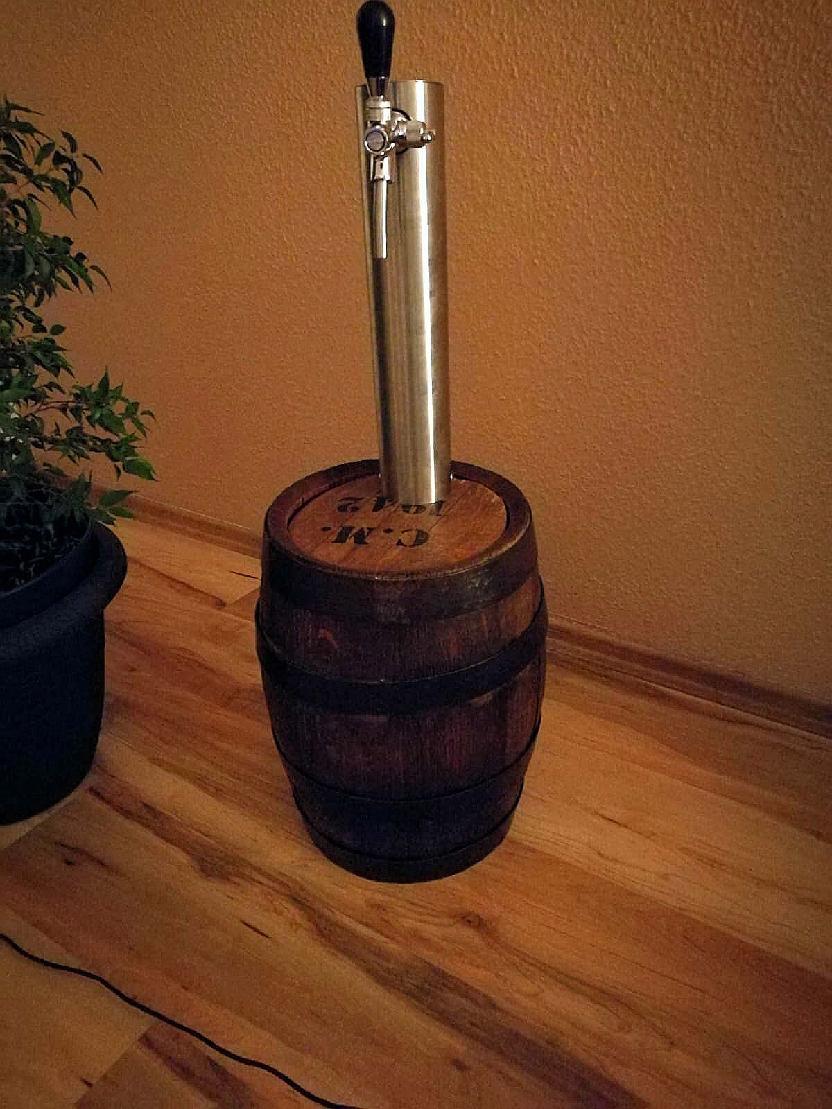 Ich habe mir daher ein komplett Set mit Schanksäule, Kompensatorhahn, Adapter fürs Fass und Kohlensäure Flasche gekauft. Inspiriert durch einen thread hier im Forum wollte ich mir eigentlich eine ganz einfache Zapfkiste bauen. Meine Chefin wollte allerdings in der Wohnung etwas Schickes stehen haben. Wir sind dann bei ebay auf ein altes Weinfass gestoßen. Ich habe dann alles kurzerhand dort eingebaut und finde es ist ganz gut geworden. Vielleicht ist es ja auch ein Anreiz für jemanden, der das handwerklich etwas professioneller hinbekommt als ich