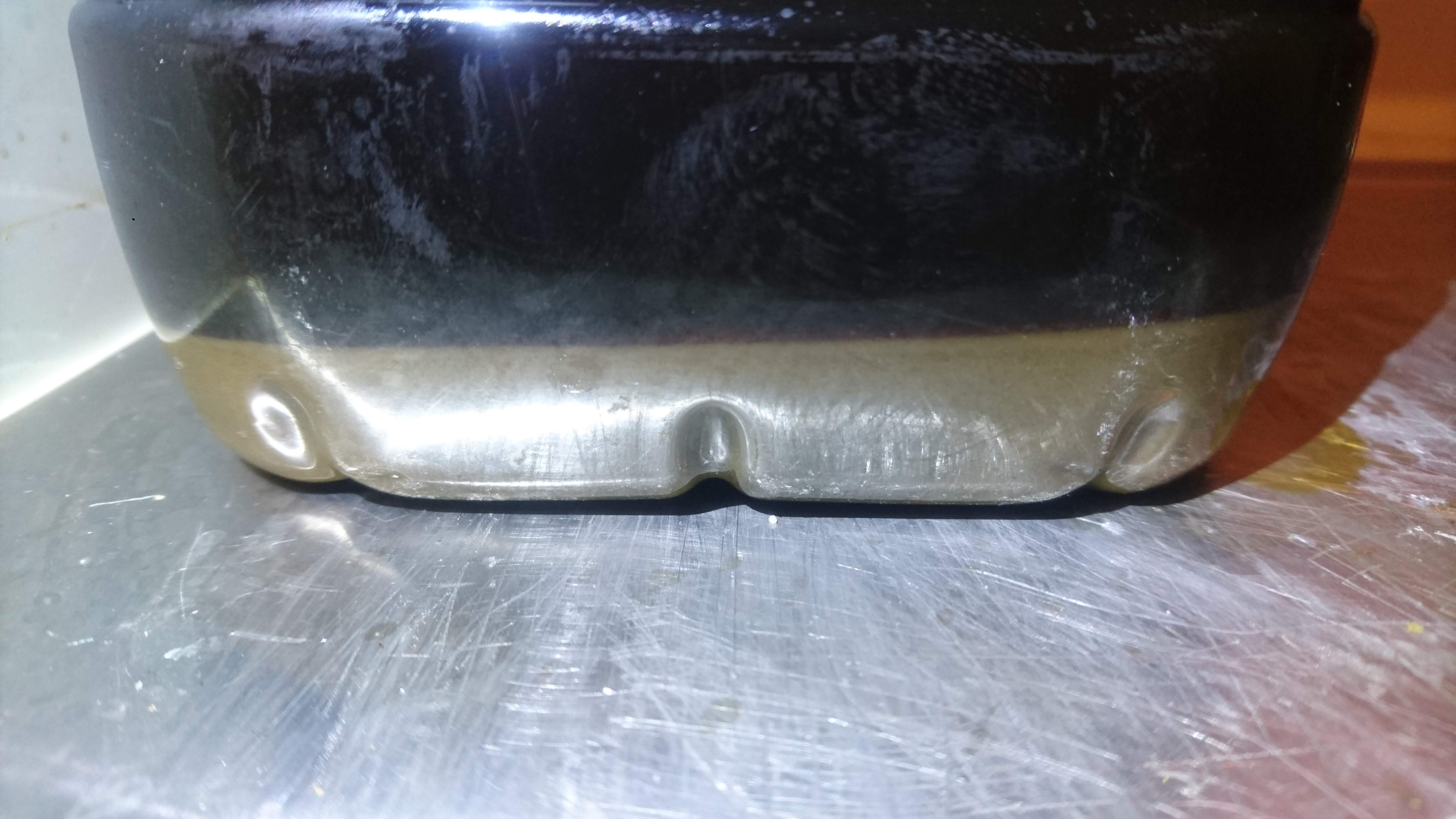 b) 50L Imperial Stout a lá nach Borzy (incl Rasten nach Originalrezept) zu sehen ist die kalte ungefilterte Speise im Purania-Behälter mit entsprechendem Bodensatz, den ich hier gerne zur Diskussion stellen würde