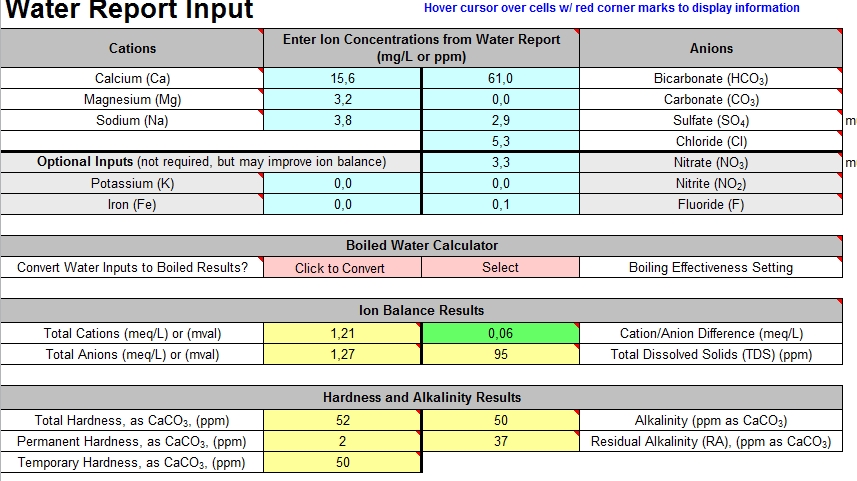 ich nutze auch BrunWater. Deine Umrechnung der Hydrokgencarbonate durch Multiplikation des Wertes mit 61 ist korrekt. Habe ich auch so gemacht.