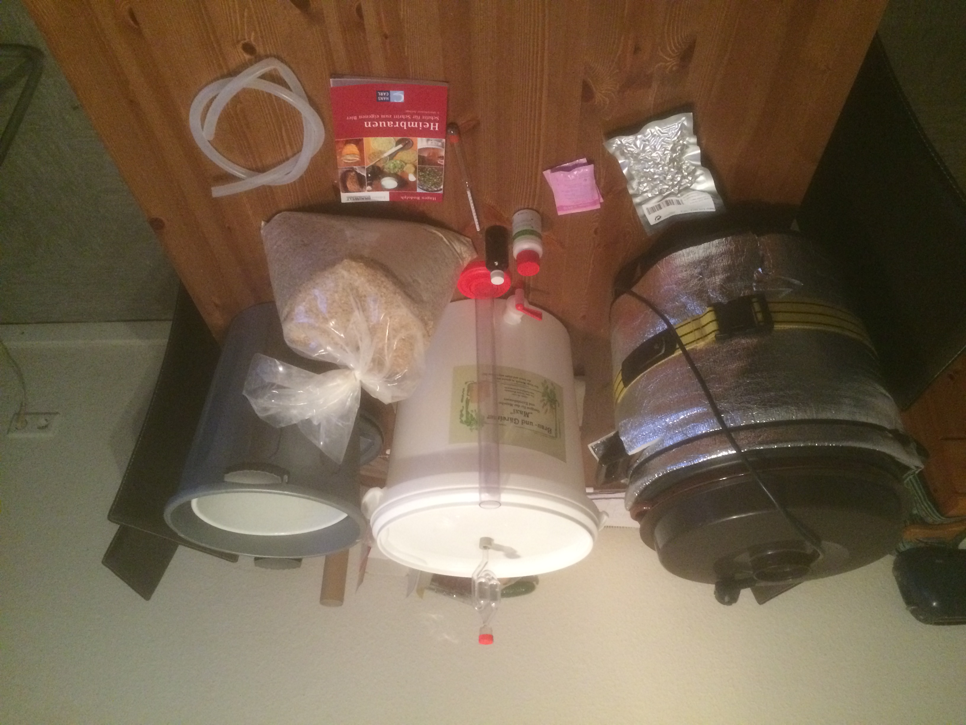 Schon vorher hatte ich mir das Anfängerbuch von Hagen Rudolph bestellt und durchgelesen (das nächste Buch wird wohl das von Herrn Hanghofer). Aus diesem Buch habe ich das Pilsener-Rezept übernommen. Auch wenn ich hier im Forum mehrfach gelesen hatte, das Pils nicht gerade das ideale Anfängerbier ist, wollte ich es trotzdem versuchen. Ich dachte bei einem Pils kann ich das Endprodukt besser vergleichen, als bei Bieren, die ich noch nie getrunken habe.