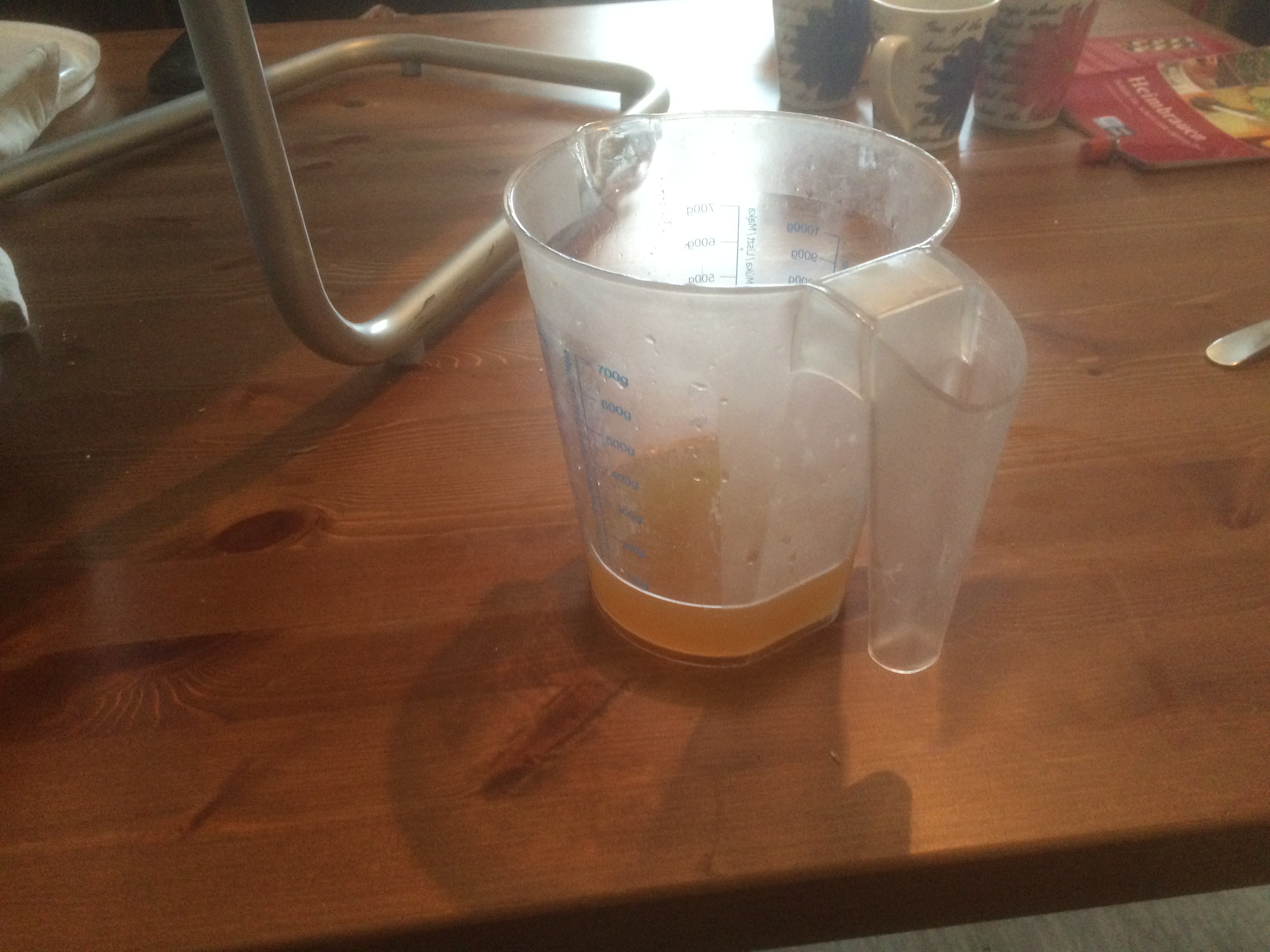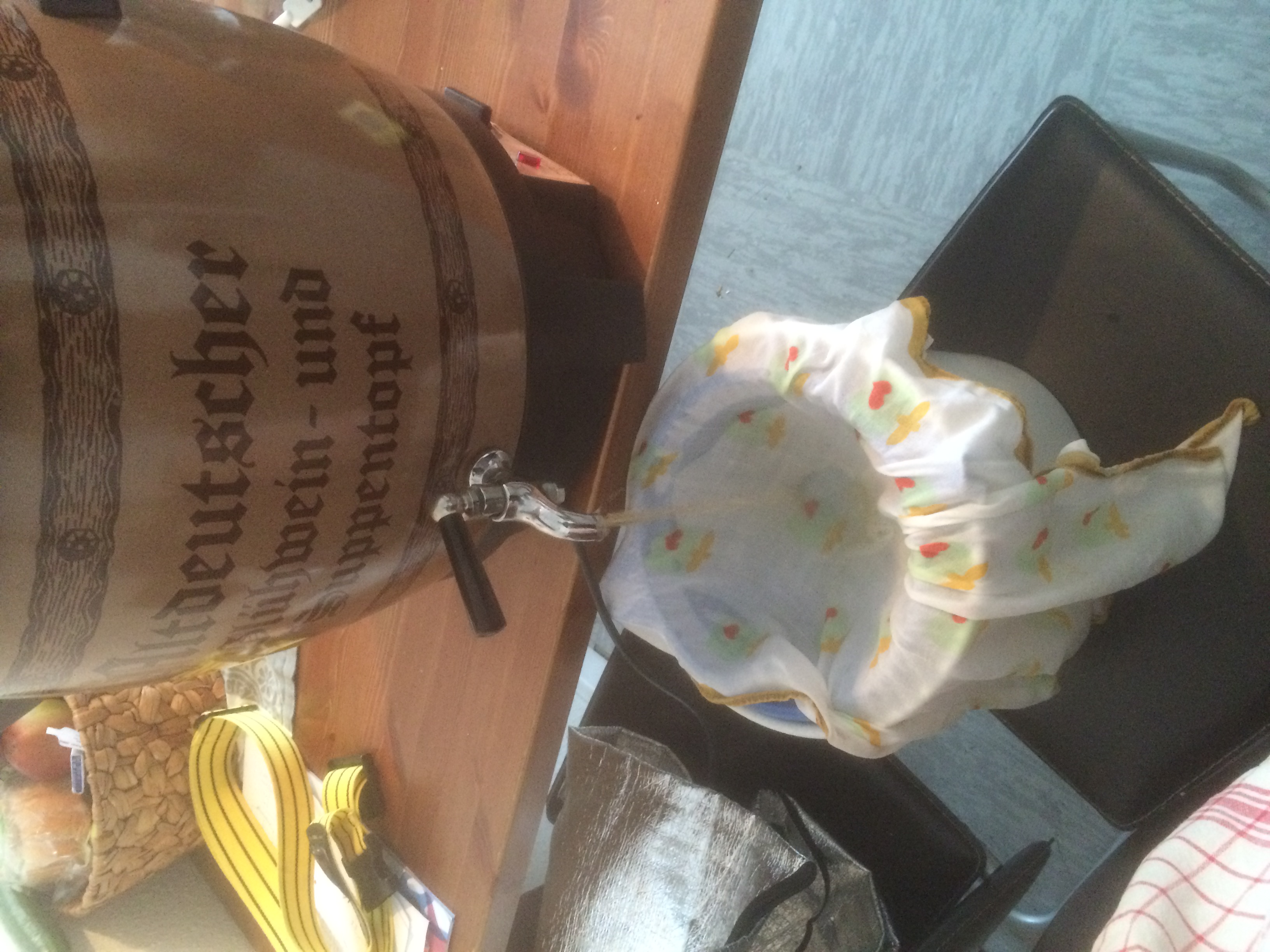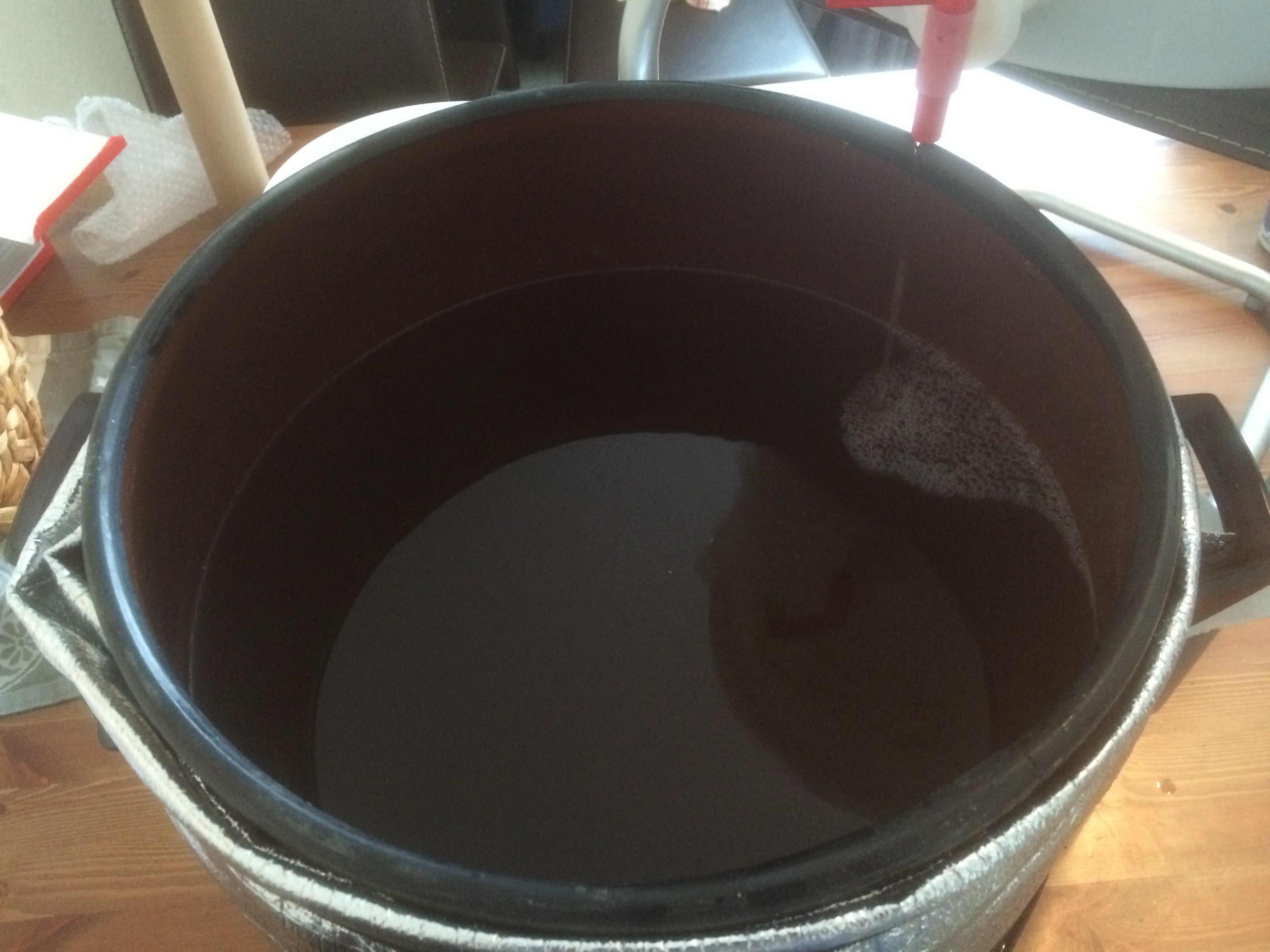 Kleine Anmerkung am Rande zum einzigen Missgeschick des Tages: der erste halbe Liter lief fabulös auf meinen Küchenboden, da ich den Hahn des Gäreimers in die falsche Richtung gedreht hatte. :Mad2
