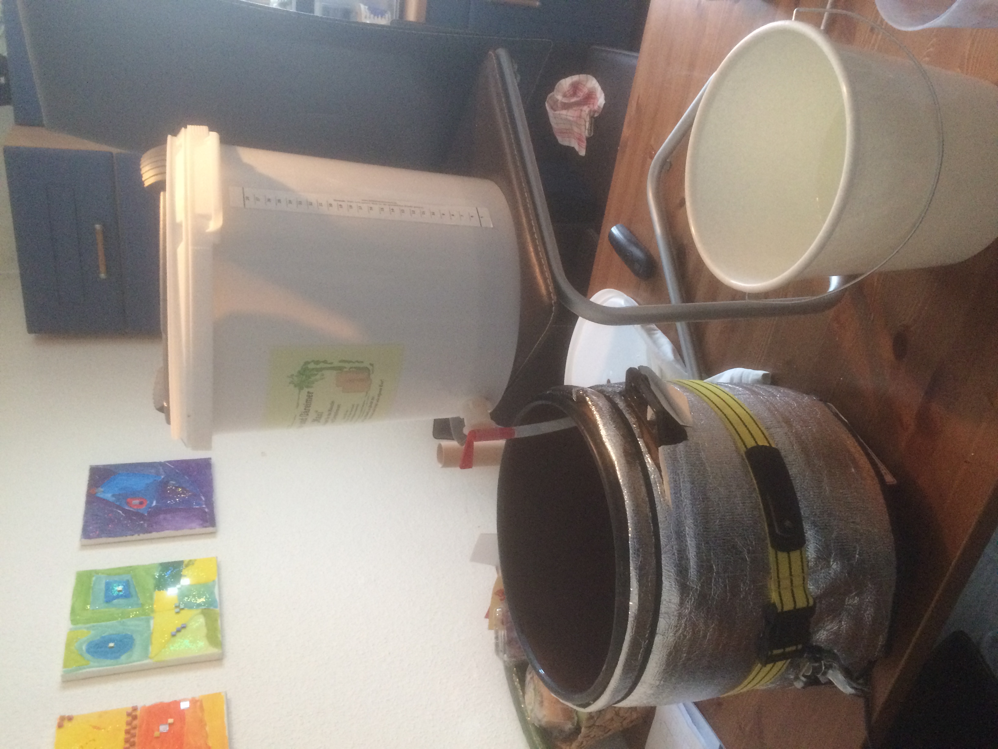 Dann ging es ans Läutern. Dies war der Punkt, der mir am meisten Sorgen bereitet hatte. Panzerschlauch war die erste Idee. Aber nach dem Besuch der örtlichen Baumärkte musste ich enttäuscht feststellen: das was ich haben wollen würde müsste ich bestellen und wäre wahrscheinlich >30€. :( Also für einen Leuterator entschieden. Leider kam der nicht mehr rechtzeitig. Somit wurde es am Ende ein "einfacher Oskar". Flink zwei Tonnen aus demBaumarkt geholt und angefangen zu bohren. Knacks - da war der erste Tonnenboden gebrochen :( Stumpfer Bohrer und zuviel Druck. Also die nächste Tonnen von innen mit Styropor drunter langsam und vorsichtig bohren. Eine Arbeit für Leute, die Mutter und Vater erschlagen haben! Ca. 50 Löcher später aufgegeben - es wird schon reichen.