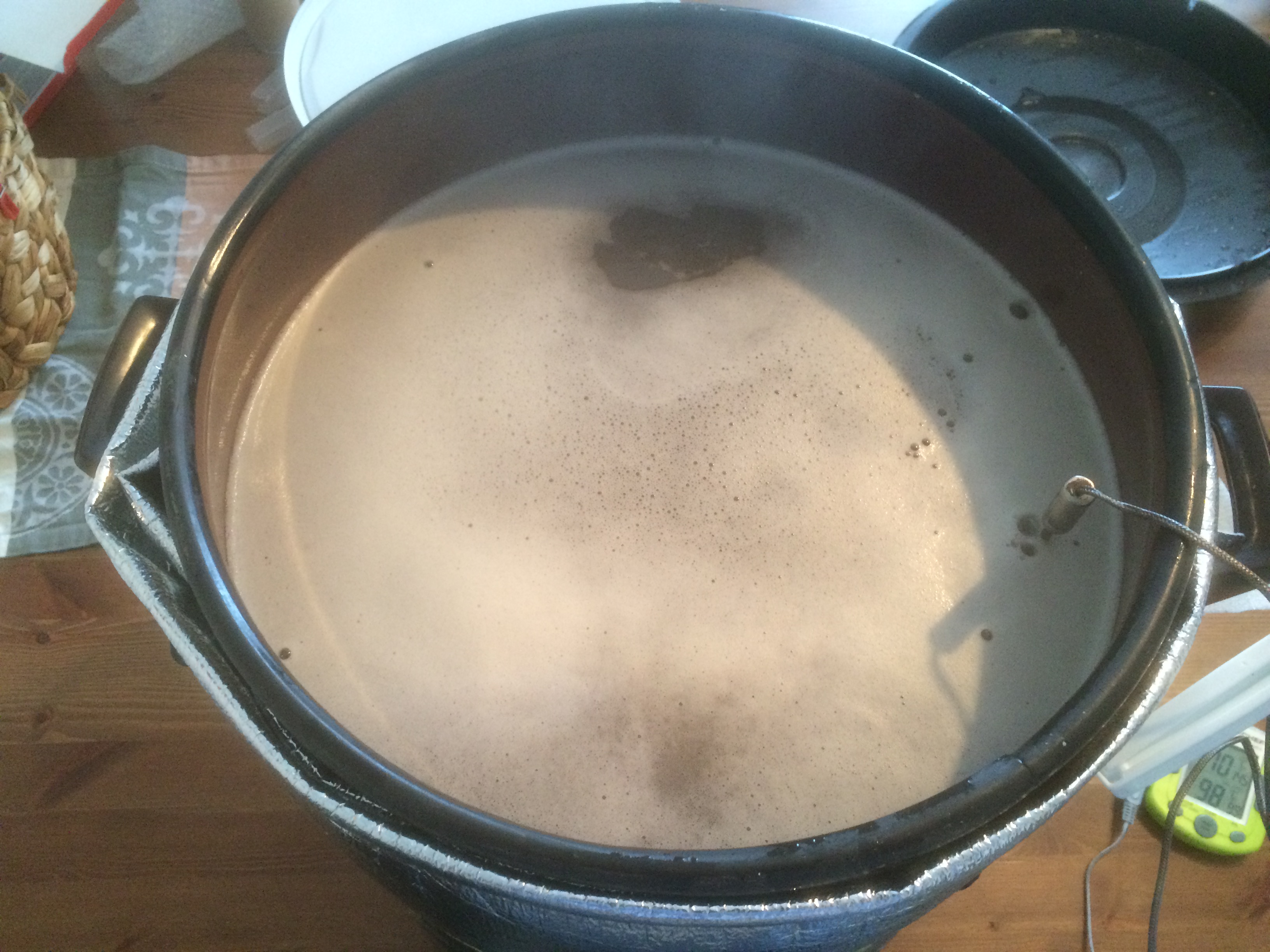 Zuerst wurde bei ca. 50°C eingemaischt in einem "Altdeutschen Glühwein- und Suppentopf" meiner Eltern isoliert mit einer Windschutzscheiben-Abdeckung: