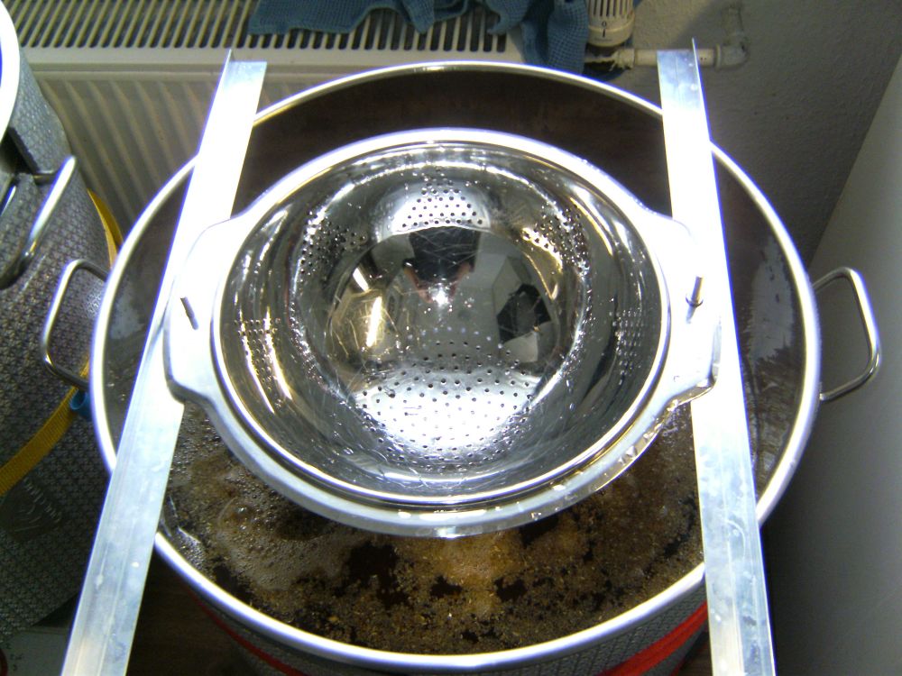 Die Nachgüsse habe ich bisher durch einen Eimer gegossen, durch dessen Löcher im Boden ca. 1l/min abfließen. Diesen Eimer hatte ich bisher recht wackelig auf zwei Holzstäben platziert; das war zum einen recht wackelig, zum anderen habe ich natürlich auch viel Temperatur verloren dadurch.