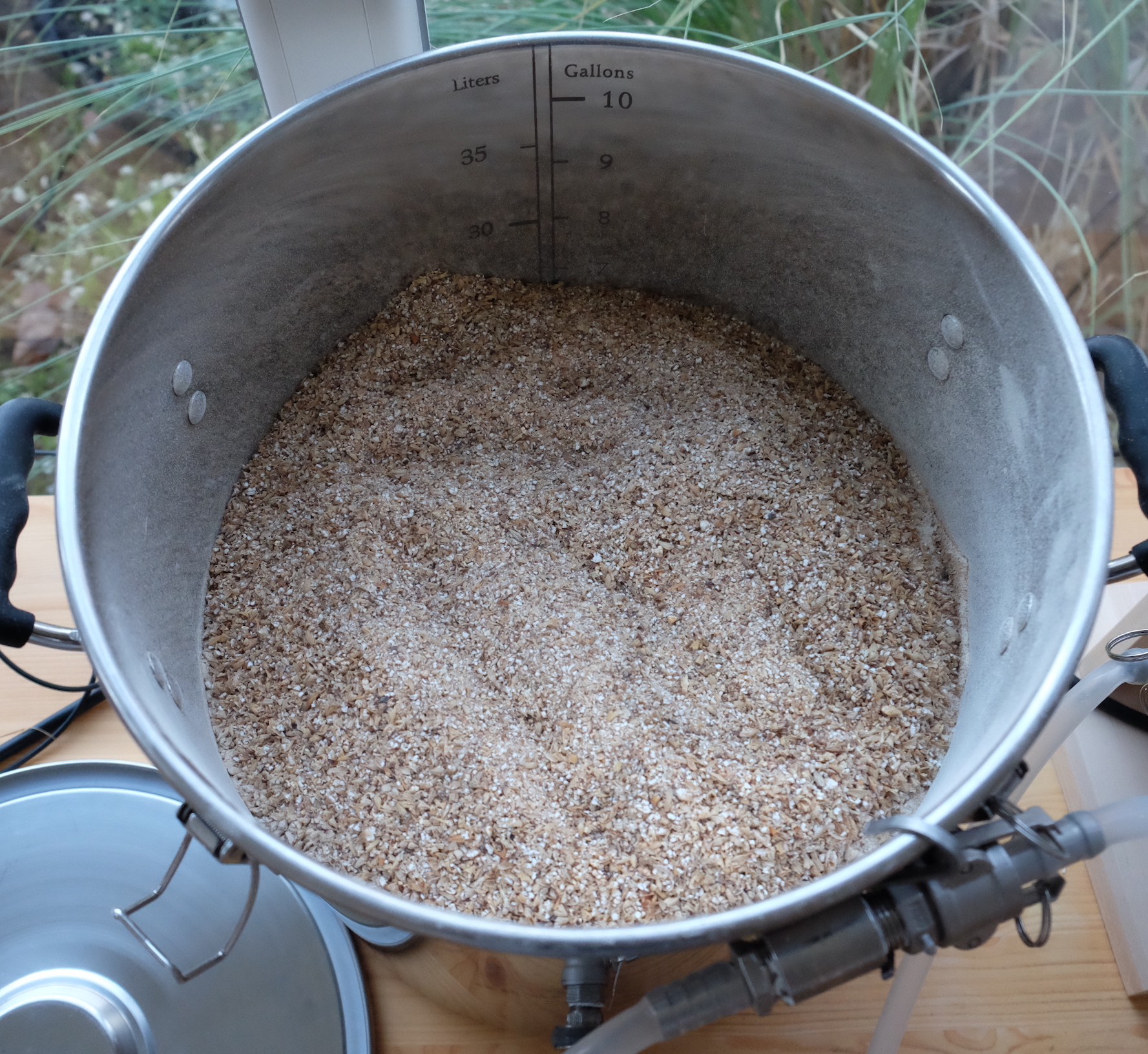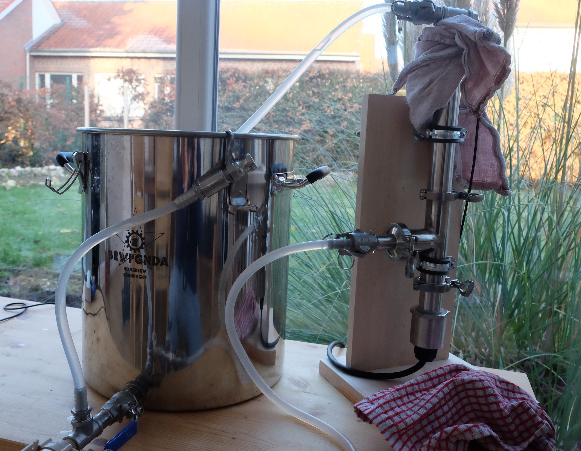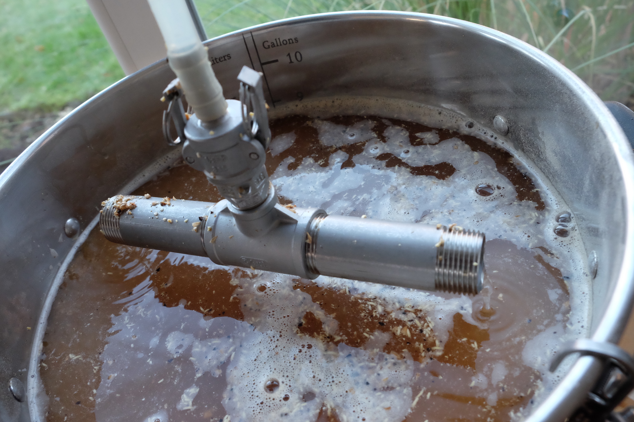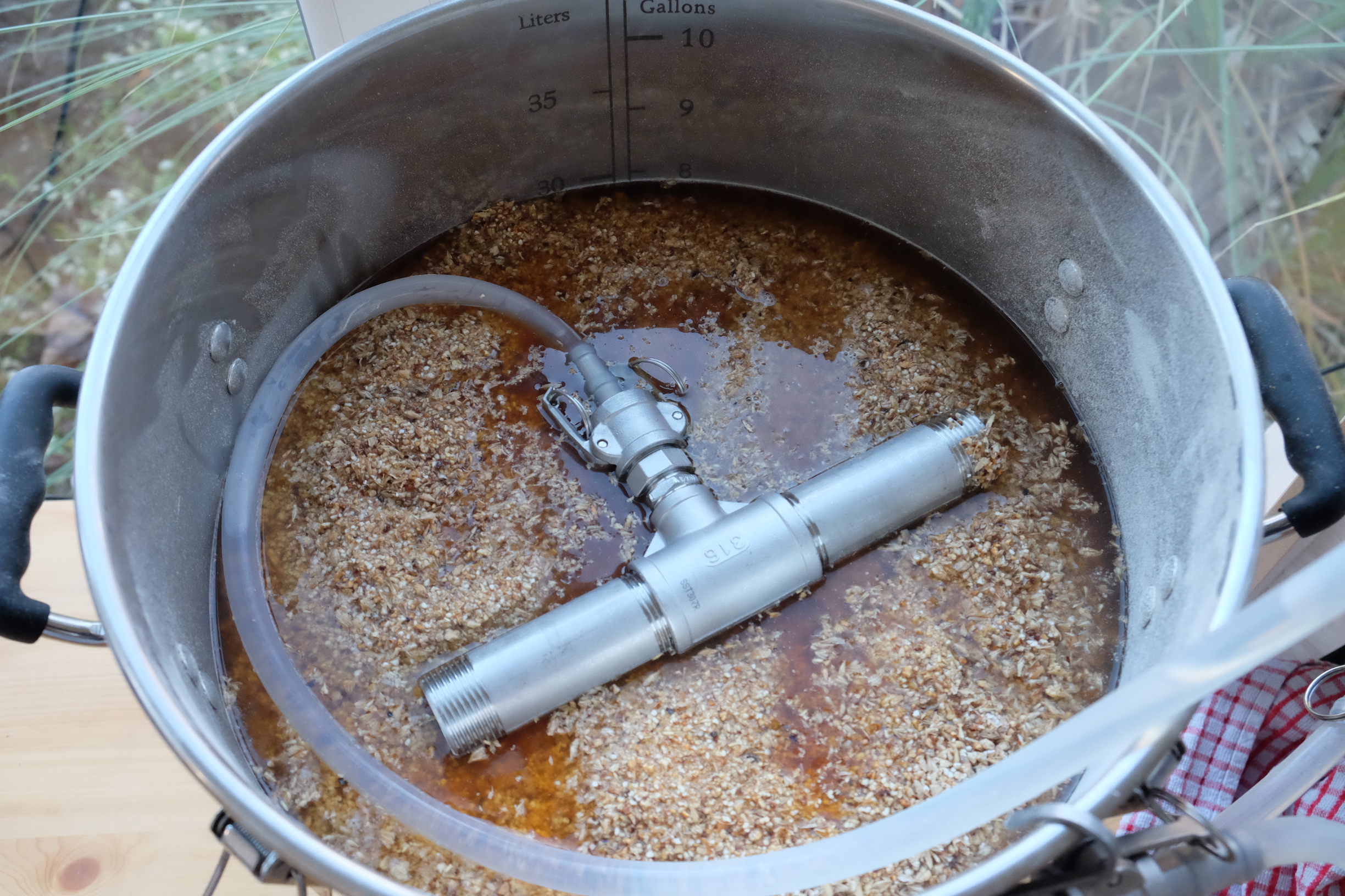 Die Pumpe habe ich übrigens mit Hilfe eines Manometers eingestellt, dazu habe ich mir an der Topfaußenseite Würzepegel und 3 und 5cm darunter markiert. Irgendwo dazwischen wollte ich landen: Parallel habe ich in der Sudpfanne gute 30L Nachguss aufgeheizt.