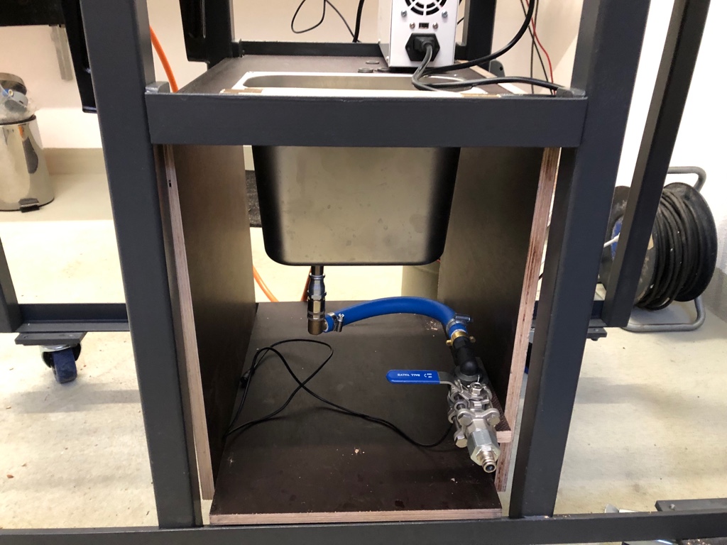 links der 70l Maischebottich, rechts der Thermoport zum läutern, in der Mitte der GN-Behälter, in den geläutert wird und dann mittels Chinapumpe in die Würzepfanne gepumpt