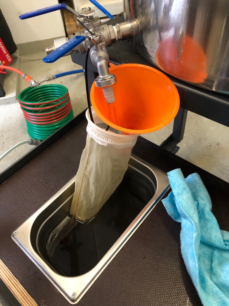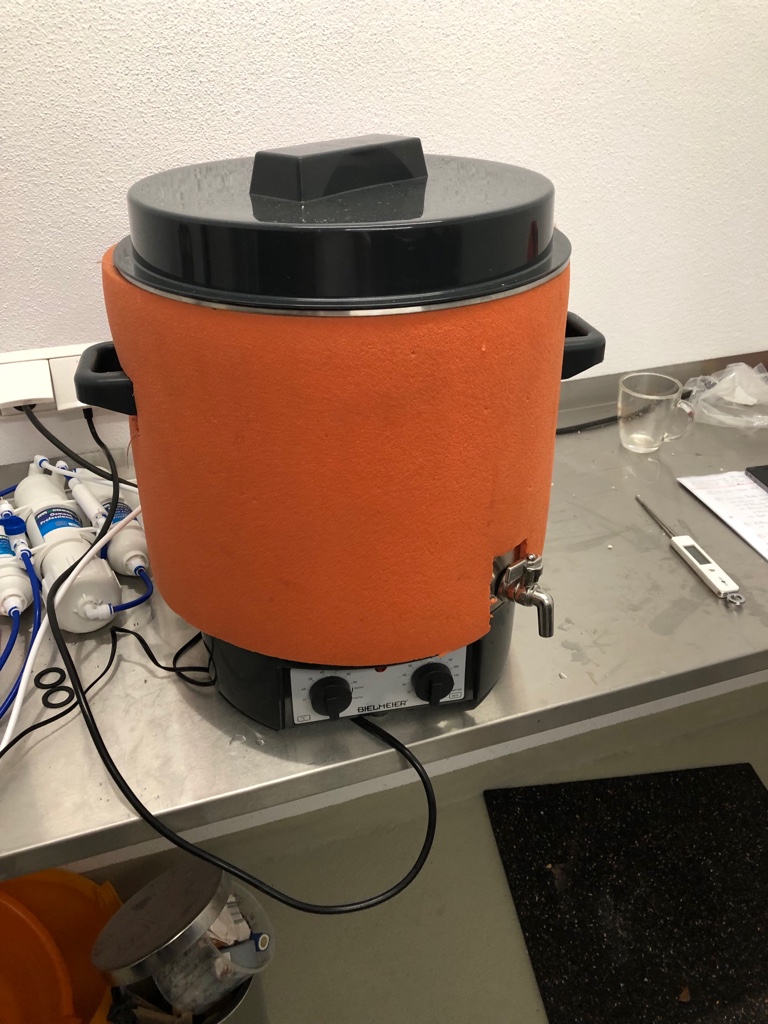 Da unser Wasser relativ hart ist (21 Grad DH), wurde am Vortag das Wasser durch unsere Osmoseanlage gepumpt und dann mittels dem Wasserrechnet von John Palmer aufbereitet. Das Abwasser habe ich in einer 300 Liter-Regenwassertonne aufgefangen und dann für den Gegenstromkühler verwendet (dieser wurde anschließend natürlich sorgfältig gereinigt, da das Abwasser ja sehr hart ist und ich keine Ablagerungen im Schlauch haben möchte...)
