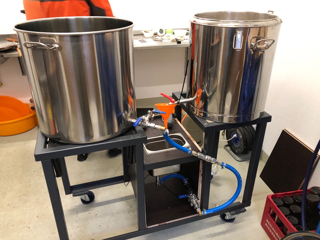 links die 100L Würzepfanne, rechts der 60L Thermoport mit Läuterhexe
