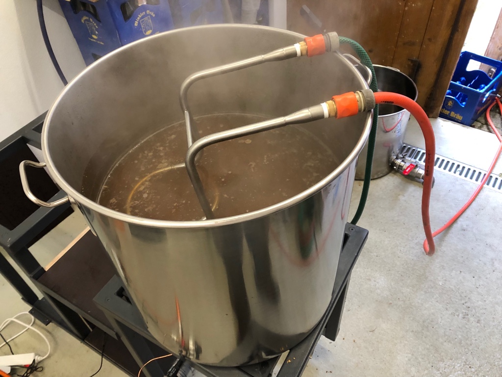 In der Zwischenzeit wurde der Gegenstromwürzekühler angeschlossen, die Würze wurde mittels Pumpe gleich ins Gärfass im Kühlschrank gepumpt: