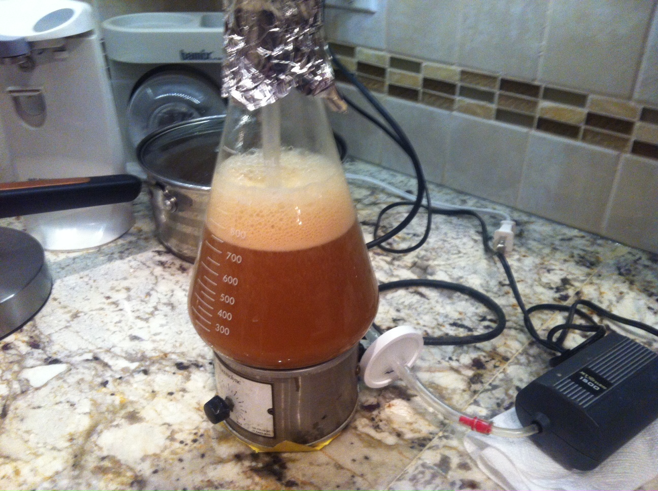 Da ich nur eine kleine Menge, mit unbekanntem "Gesundheitszustand" hatte, habe ich ihr erstmal nur 300ml Nahrung gegeben. Dazu habe ich eine 9Plato Lösung aus Trockenmalzextrakt und einer mini Prise Wyeast Hefenahrung hergestellt. Dann kam die Hefe rein und ich habe das Ganze auf den Magnetrührer gestellt. Mit einer Aquariumpumpe leite ich Luft in den Erlenmeyerkolben. Ich leite die Luft nun extra nicht mehr in die Flüssigkeit ein, da ich so schon mal Schaumpartys hatte.