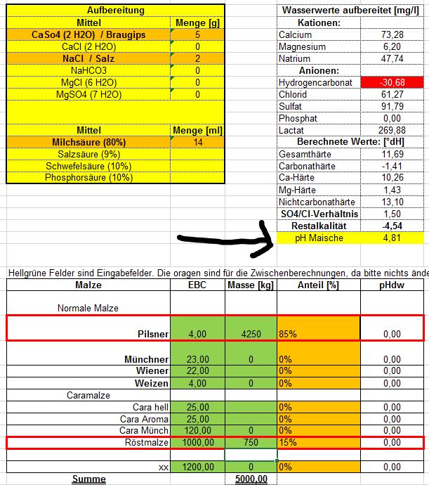 Ich habe die Werte per Schlupfrechner ermittelt. Das Wasser würde ich für meine Ausgangswerte etwa so einstellen (habe momentan nur Braugips und Milchsäure). Komme dabei auf pH 5,78 (Brauwasser für Pils eingestellt)