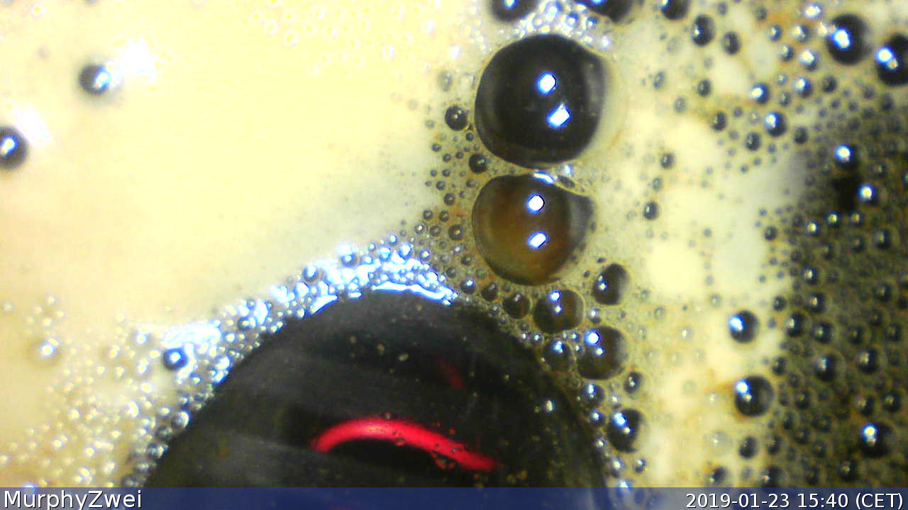 Es gibt für vergleichsweise wenig Geld USB "Endoskop"-Kameras im Netz zu bestellen. Gedacht sind die vornehmlich um in schwer zugängliche technische Geräte, Abflüsse und so weiter hineinzuschauen. In den Angeboten ist meist der Betrieb am Handy mit App zu sehen, geklappt hat es bei mir auch mit dem Raspberry Pi und den dortigen Standardanwendungen. Dem Einsatzzweck entsprechend ist das Bild nur im Bereich ca. zwei bis zehn Zentimeter vor der Linse scharf und zeigt einen recht engen Bildausschnitt. So eng, dass man größere Blasen zum Ende der Gärung schon mal vor Schreck für eines der Kahmhefenbilder hier halten kann - war zum Glück Fehlalarm