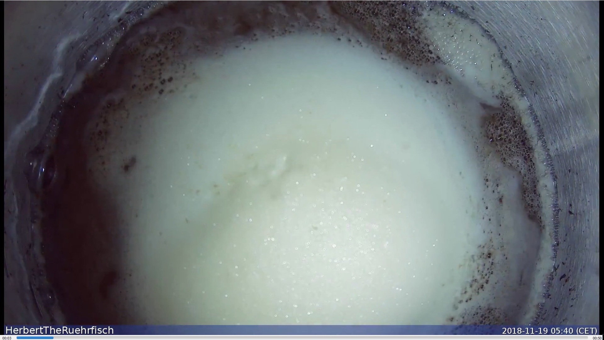 Der Raspberry, der auch die iSpindel bedient, macht mit "fswebcam" in einem bash Skript alle zehn Minuten ein Foto und schickt es mir zusammen mit den iSpindel Daten via Internetrouter auf einen Cloud-Speicher. So kann ich auch unterwegs sehen, was im Gärtank gerade los ist. Mittels der Software "avconv" kann der Raspberry aus den Einzelbildern auch einen Zeitrafferfilm erstellen. Da geht leider auch dem Raspberry 3B schnell die Puste aus - 640x480 bei niedrigster Qualität ist das höchste. Für den Zeitrafferfilm in 1280x720 setze ich daher nach wie vor auf den PC. Es lohnt sich! Die Gär-Filme auf dem großen Wohnzimmerfernseher schlagen so einige Angebote im Free TV