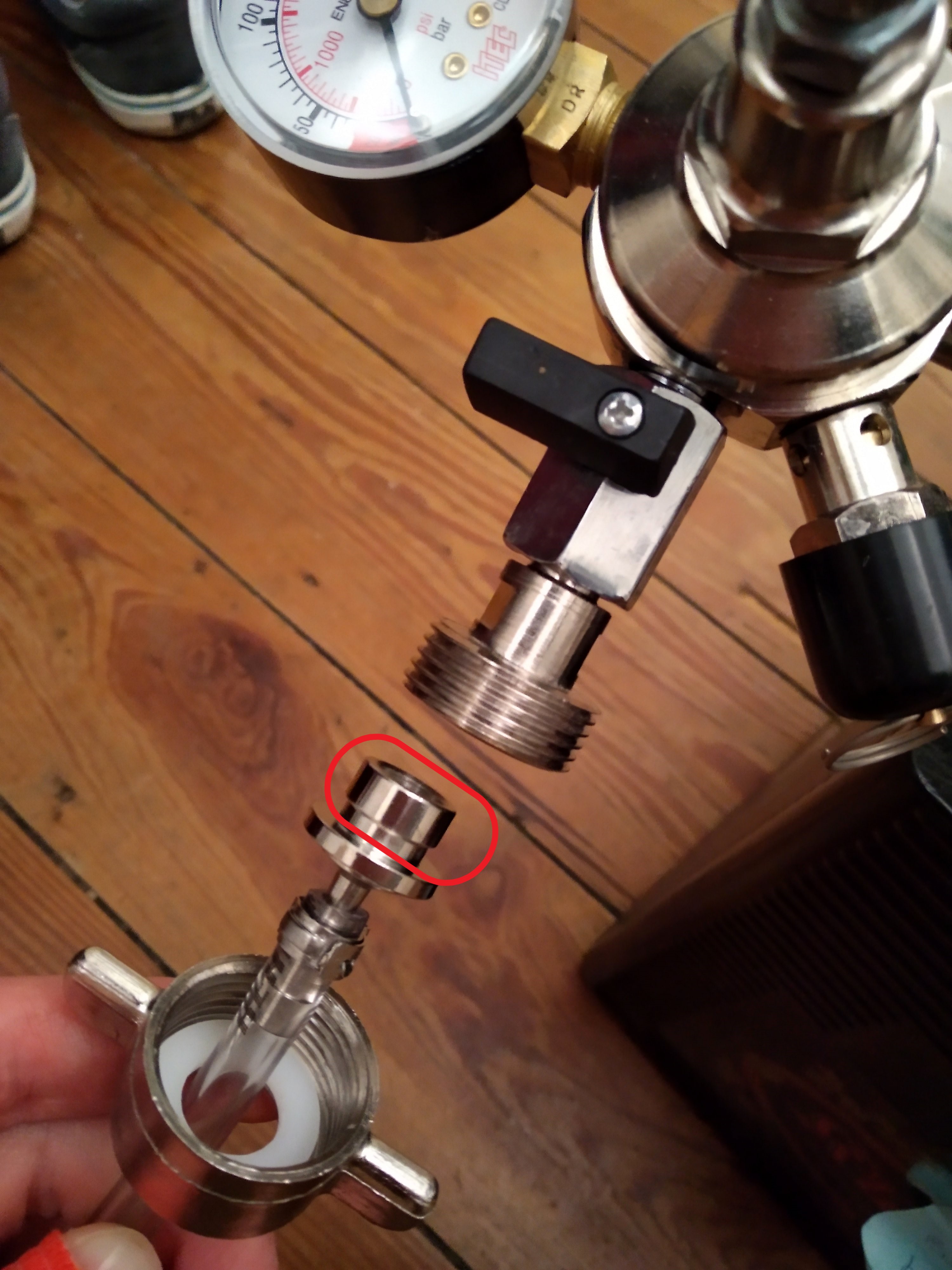 das gesamte Equipment für das Befüllen von NC-Kegs ist endlich beisammen und nach den ersten Tests zeigt sich ein deutliches Gasleck zwischen dem Druckminderer und der 3/4 Überwurfmutter bzw. der Tülle des Co2 Schlauches. Bei der Gasleitung handelt es sich um ein komplett montiertes Set von einem gängigen Hobbybraushop.