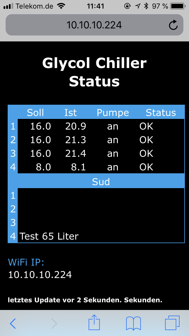 Wenn das Glycol kalt genug ist läuft von Zeit zu Zeit nur die Pumpe für die Gärkreislaufkühlung an. Das ist ein leises Summen. Hört man kaum. Deutlich leiser als ein moderner Haushaltskühlschrank.