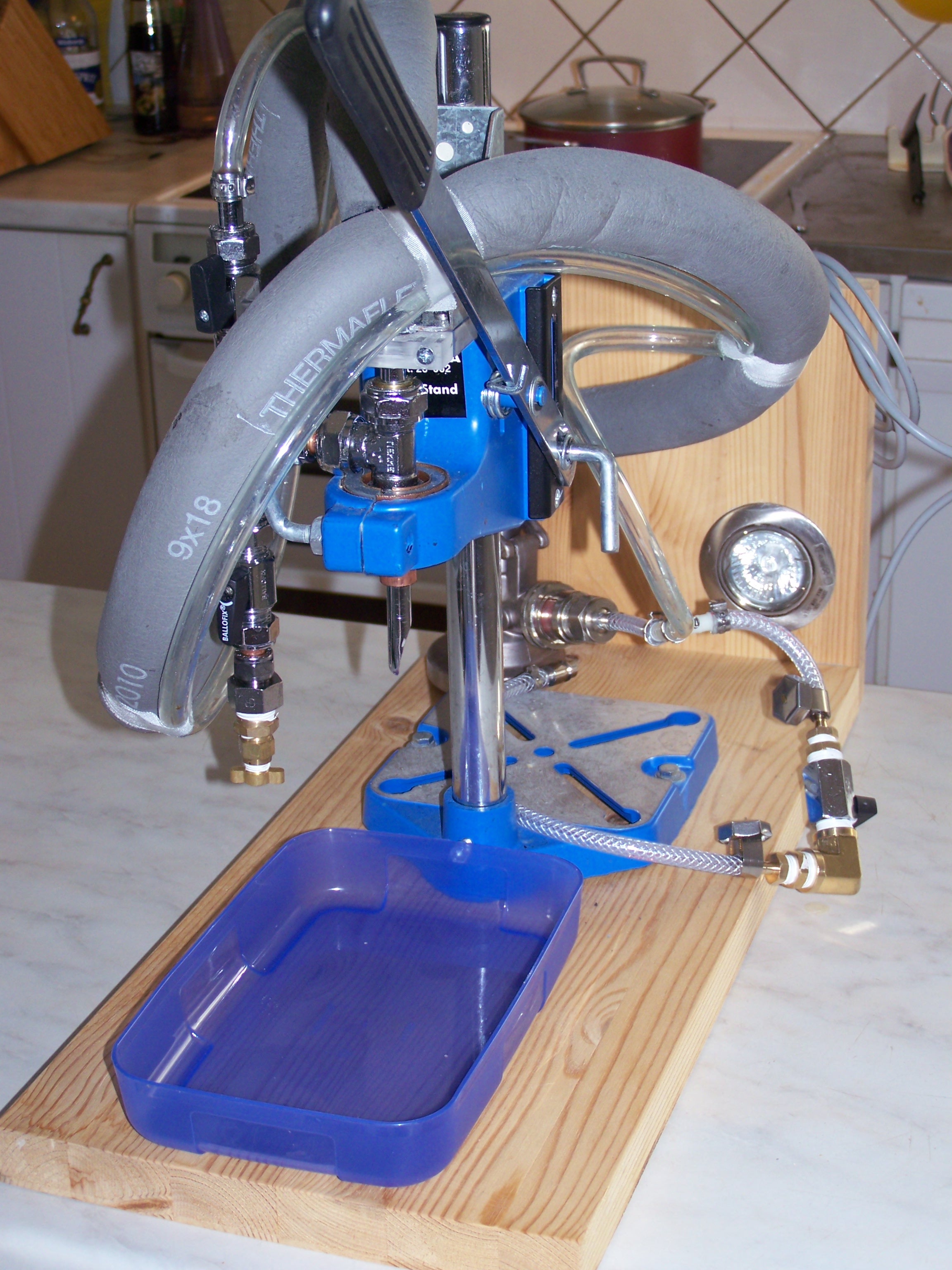 Ich schreibe aber weil ich auch die Idee mit dem Bohrständer hatte.Ich habe aber einzelne kleine Kugelhähne verwendet weil kein 3-Wegehahn beschaffbar war.