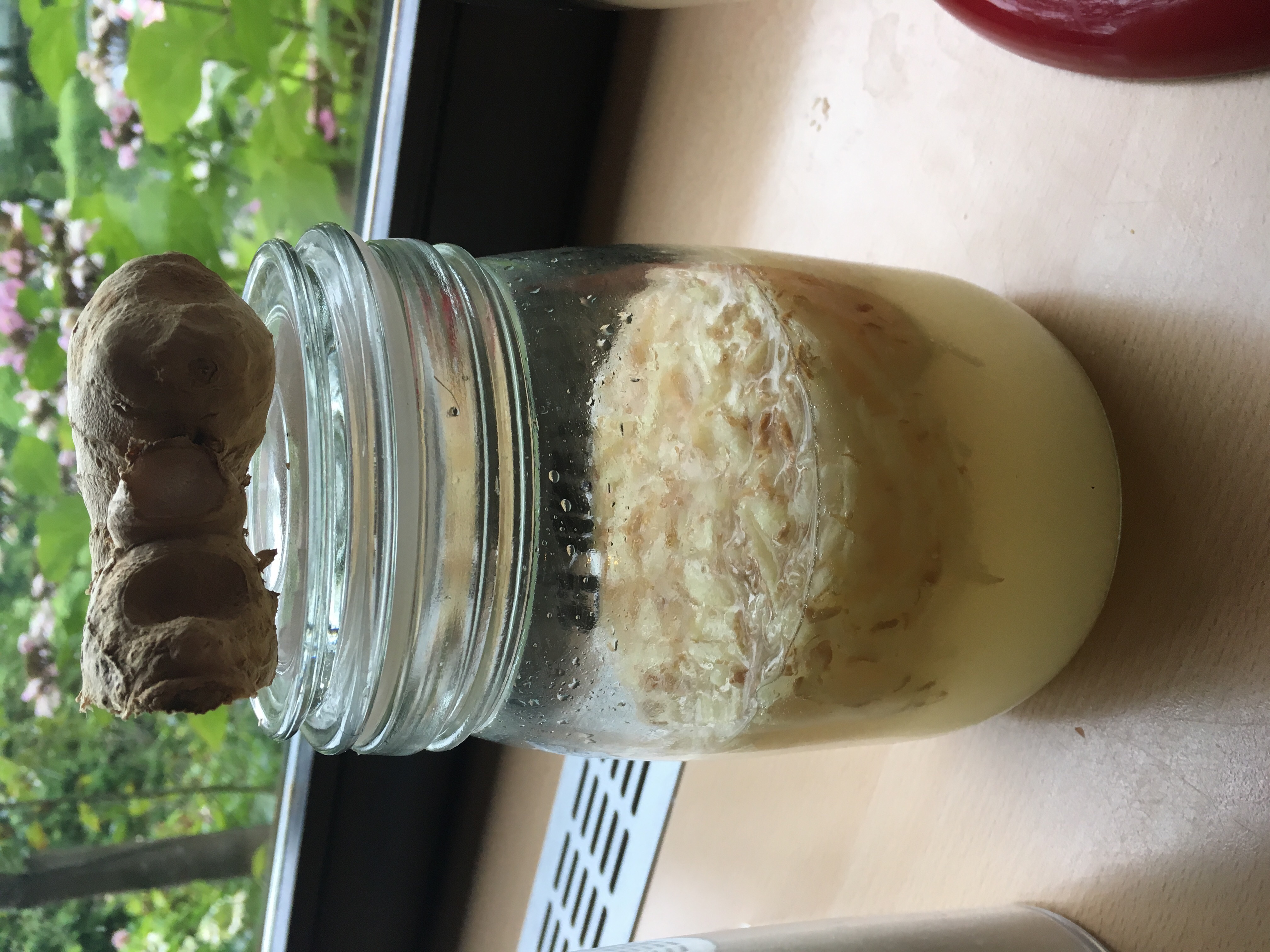 25g geriebener Ingwer + 2TL Zucker + 0,5l Wasser (das geht jetzt 5 Tage lang so weiter, nur Wasser wird nicht mehr zugegeben) Ach so, im Schraubdeckel ist natürlich ein kleies Löchlein.