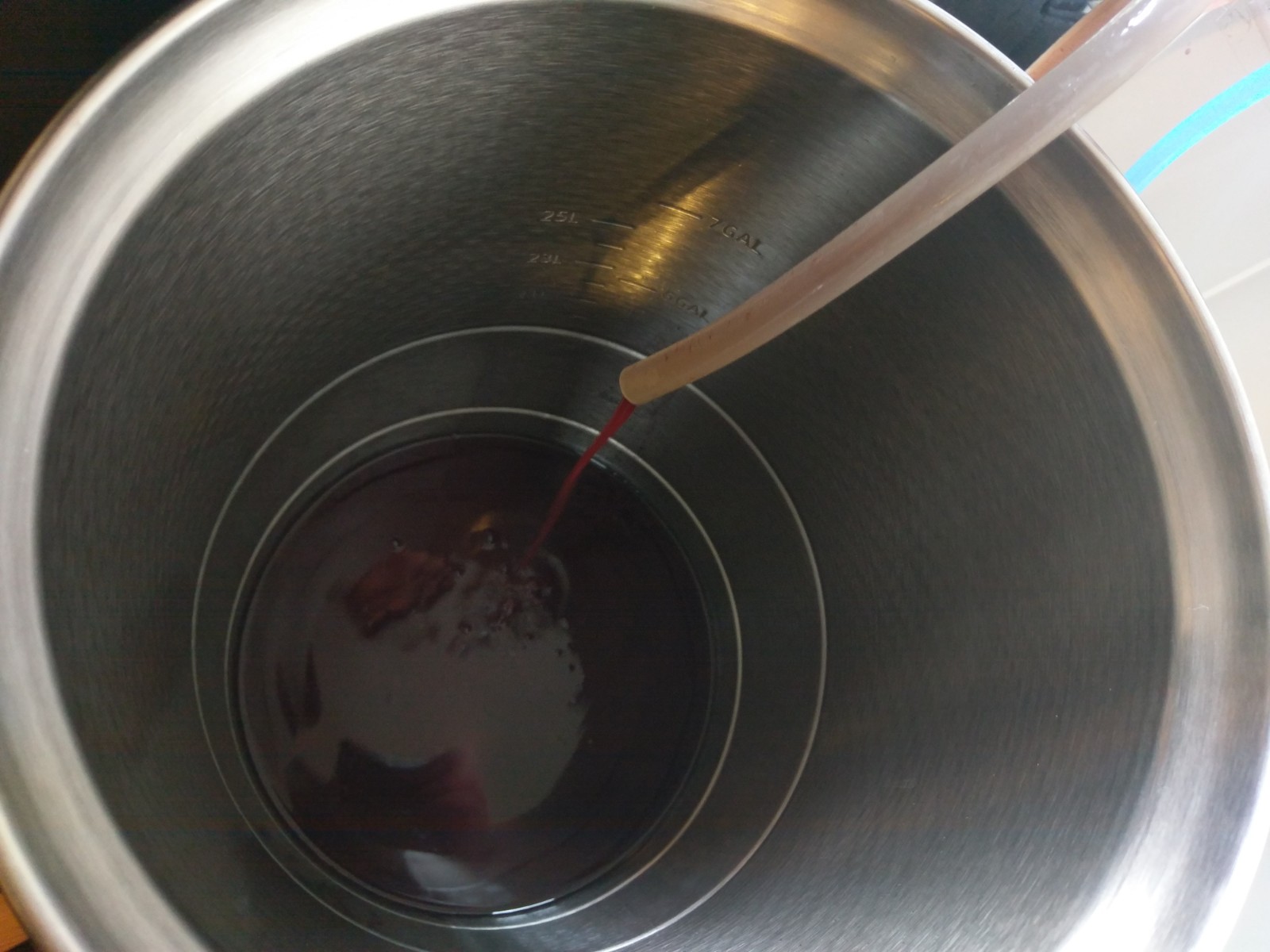 Aber das Rohgetreide musste ja erstmal verkleistert werden. Also die 2,5kg lila Mais (die ich dankenswerter mit der Corona eines Foristen schroten durfte) in einen großen Topf und für 30 Minuten kochen. Da hab ich erstmal gestaunt. Selbst als ich die Wassermenge auf 7L erhöht und damit immer näher an den Rand des Fassungsvermögens des Topfes gekommen bin, war das Zeug noch immer dick wie Milchreis mit Zement und dank der Farbe sah es aus wie Omas rote Grütze. Gut dass wir zu zweit gerührt haben, das Zeug war echt schwer zu rühren und wollte natürlich gerne ganz schnell anbrennen. Glücklicherweise konnten wir das verhindern, hatten aber Muskelkater am Folgetag Da das Getreide nicht vermälzt ist haben wir zur Proteinrast bei 50°C eingemaischt und dort gehalten, bevor wir anschließend für eine Stunde eine 66°C Kombirast gefahren sind. Abgemaischt wurde bei 78°C damit die Viskosität verbessert wird. Das Problem an der Sache: Der Milchreis-Zement-Effekt trat auch hier im Grainfather auf. Schnell wurde klar dass hier wirklich nichts mehr durch den Malzkorb fließen konnte, weshalb ich auf einen Trick zurückgriff, den ich hier irgendwo im Forum mal für schwierige Maische im Grainfather gesehen habe: Oberes Sieb ab und alle paar Minuten den Malzkorb manuell umrühren. So ging es dann wohl. Bevor ich die Kombirast beendet habe, wurde natürlich noch eine Jodprobe gemacht. Denn wir sind ja klug, wir wollen ja bei der Rohfruchtmaische keinen Blausud riskieren. Hab ich gedacht. Nur schwierig in einer lilanen Maische eine lilane Verfärbung des Jodes zu erkennen: In dem Moment des Zugebens des Jodes konnte man aber sehen, dass es hauptsächlich gelbliche Farbe hatte. Beim verrühren mit der Probe war dann alles lila, allerdings ohne den bläulichen Stich, den die Jodprobe bei mir bei Stärke hat. Daher habe ich mal vorsichtig angenommen, dass die Verzuckerung durch sein müsste.