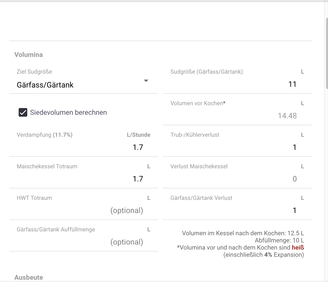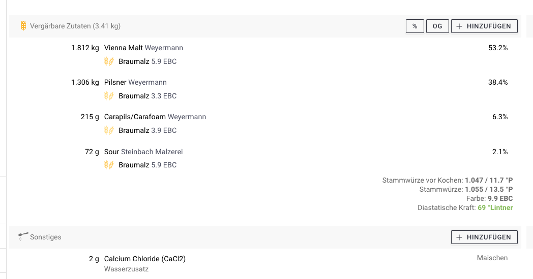 Beim manuellen Erstellen eines Rezepts wird übrigens nach einer Menge des Malzes gefragt (Prozenteingabe ist nicht möglich). Also wird vorerst ein OG berechnet.