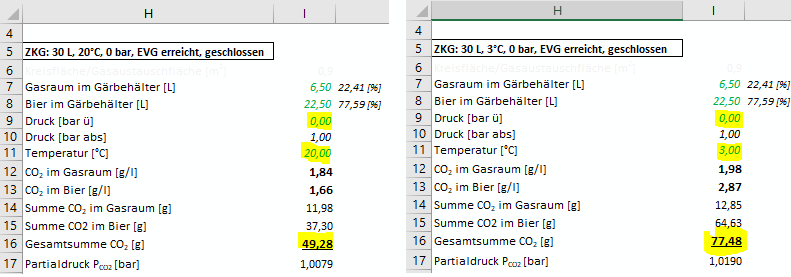 Die entscheidende Zahl steht in I13. Berechnet hat sich im Gärverlauf und bis kurz vor dem Cold Crash ein CO2-Gehalt von 5,26 g/l eingestellt.
