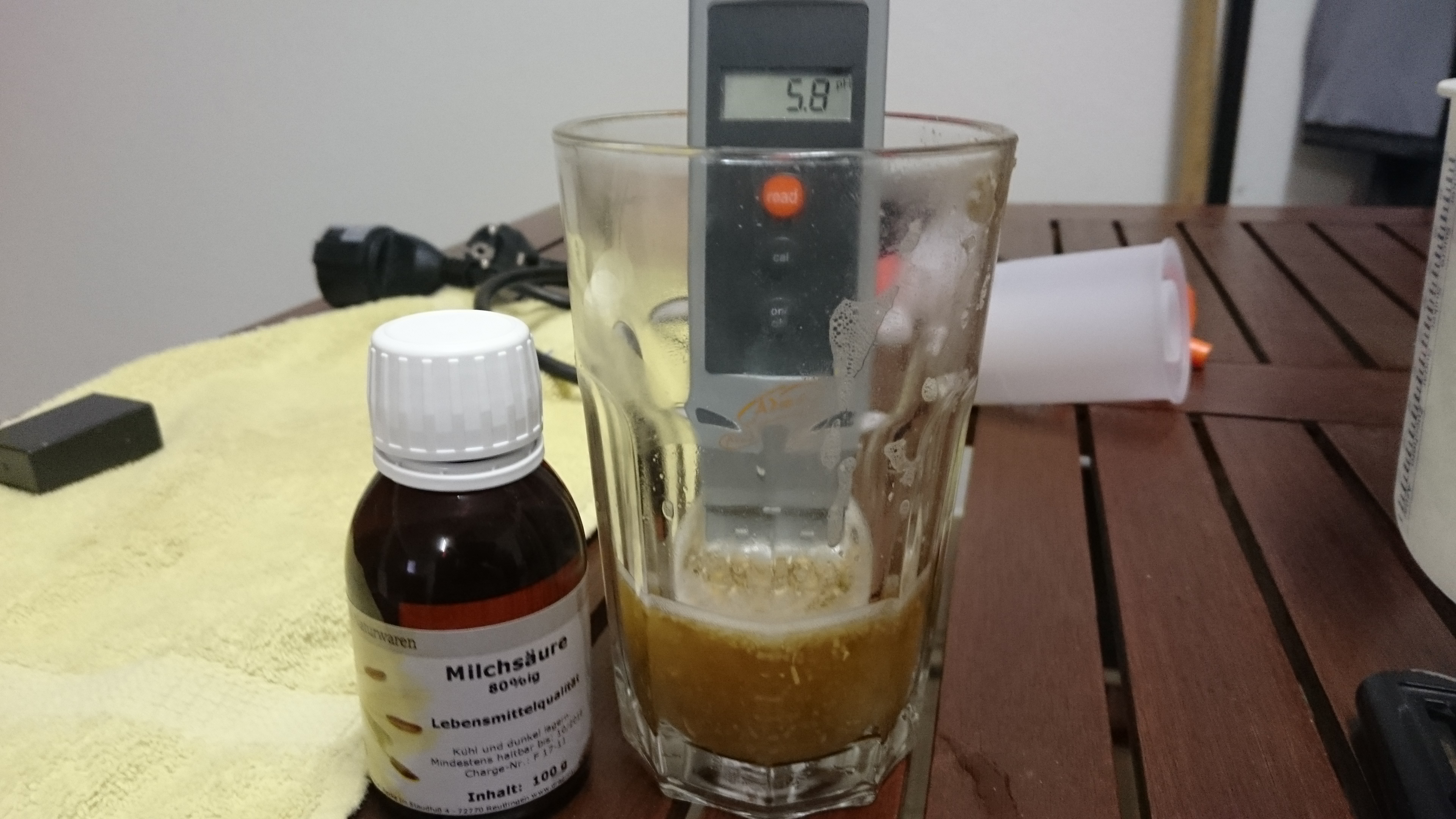Danach Hopfenkochen und zwar dieses Mal (zum ersten Mal) ohne Säcke. Wir haben bemerkt, dass sich die Würze trübte. Wir dachte, es wäre nicht weiter schlimm - nach Whirlpool und Hopfenseihen bestimmt kein Problem. Allerdings, nach dem Whirlpool haben wir beim Umschlauchen bemerkt, die Würze was milchig Trüb - auch nach Mikrofilter. Da eh nichts zu machen war, haben wir runtergekühlt und mit S-05 angestellt. Seit dann liegt das Bier bei 17°C und die Hefe fühlt sich wohl. Am letzten Bild erkennt man aber, wie Trüb das Jungbier ist. Ich habe ein Glas abgezwickt und bei 2° im Kühlschrank gestellt. Schau ma mal ob das Jungbier sich bei Kälte über den nächsten Tage/Wochen klärt...