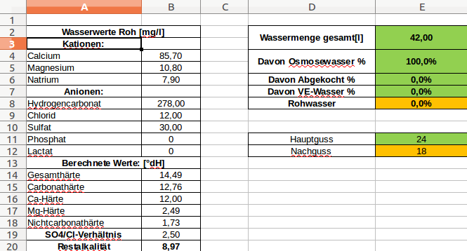 Dieser Wasserrechner ist bei Weitem nicht so flexibel wie SchlupfsWasserrechner. Gerade in dem Hinblick, dass ich aufgrund des Ionentauschers auf Osmosewasser setzen möchte.