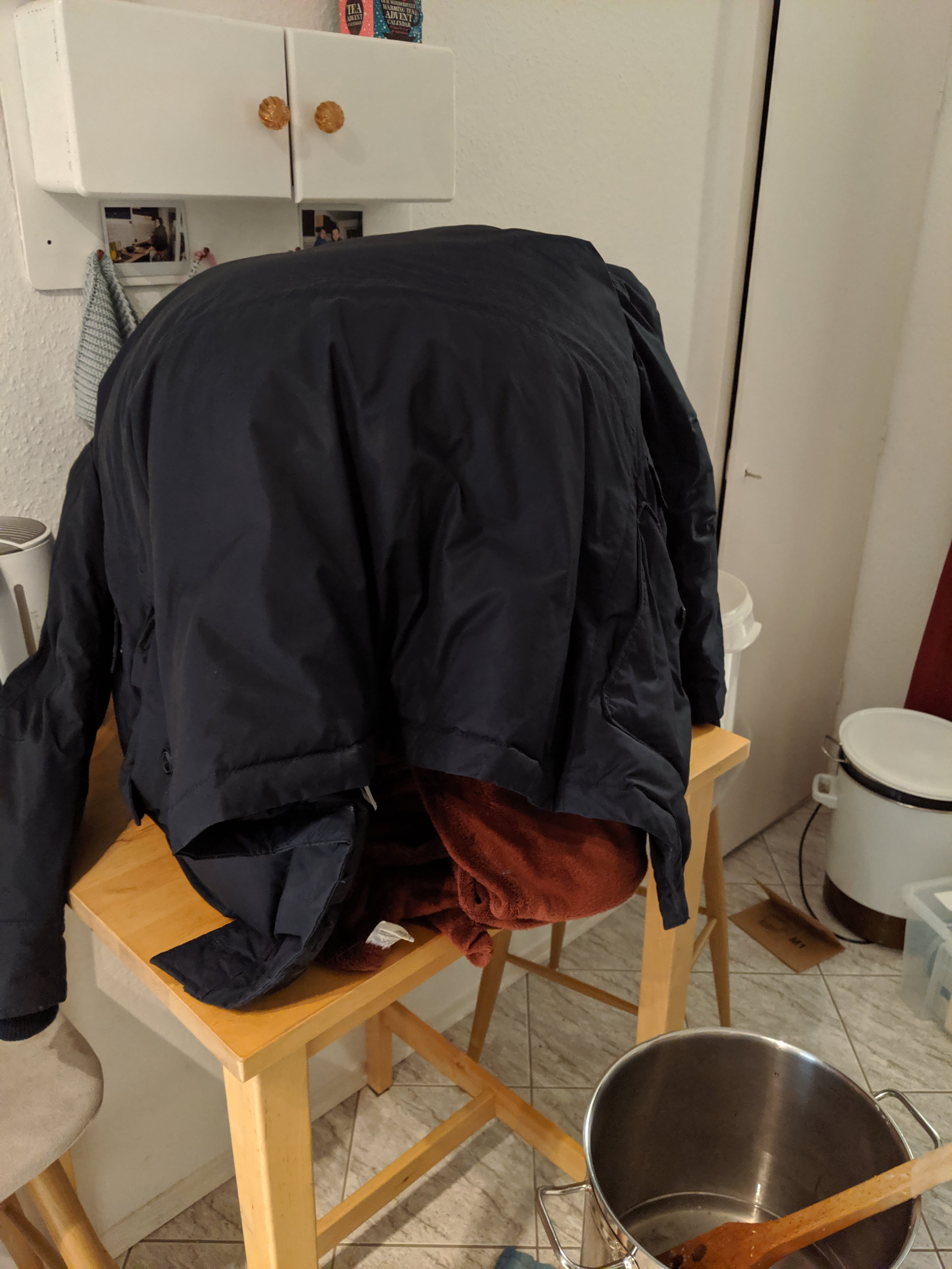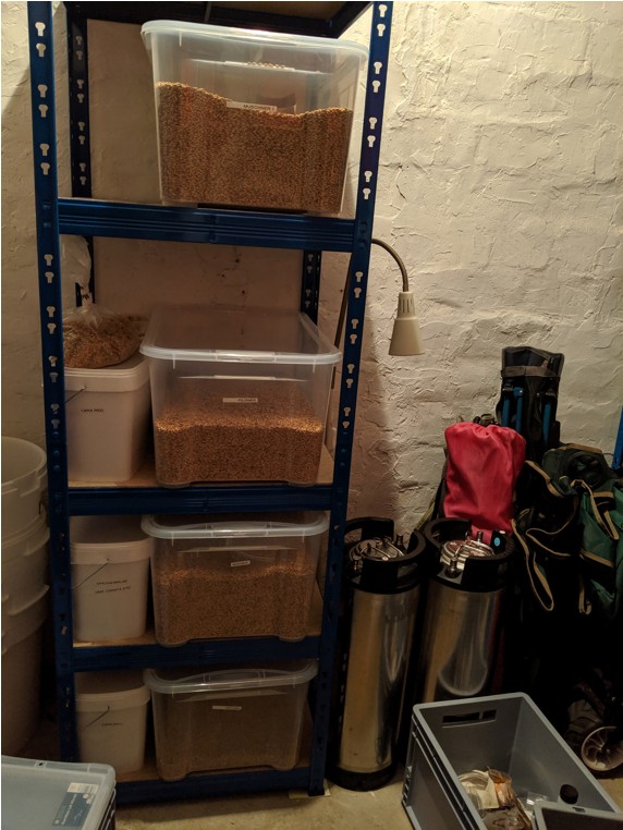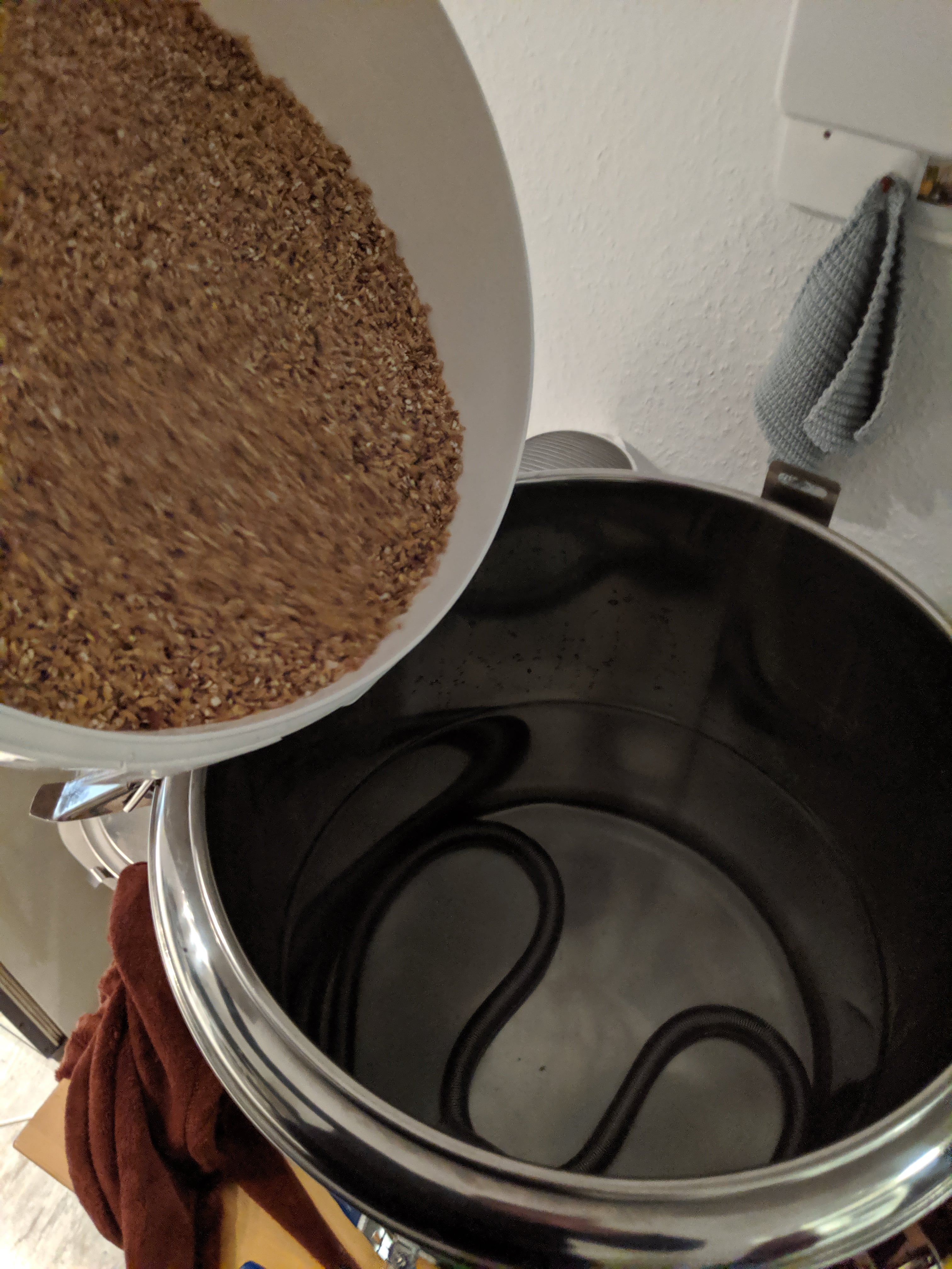 Kurz vor der Arbeit ging's in den Keller und dann wurde erstmal das Malz zusammengesucht: Das Schroten ging dann gut von der Hand und ich konnte ins Büro. Dann also zur Arbeit und zum Sport und abends dann ans Werk. Die Temperatur für die Eiweißrast fast getroffen. Hier hab ich mich mit der thermischen Masse vom Thermoport vertan. Aber gut, dann war's eben 1°C mehr. Dann heißes Wasser zubrühen, um die Kombirasttemperatur zu erreichen. Hat gut geklappt. Dann den Thermoport gut einpacken und gute Nacht sagen. Bevor ich ins Bett komme, noch schnell den Cold Steep vorbereiten. Nach knapp 9 Stunden ging's dann zurück in die Küche. Die Temperatur im Thermoport lag noch bei 61 °C, also alles ok.