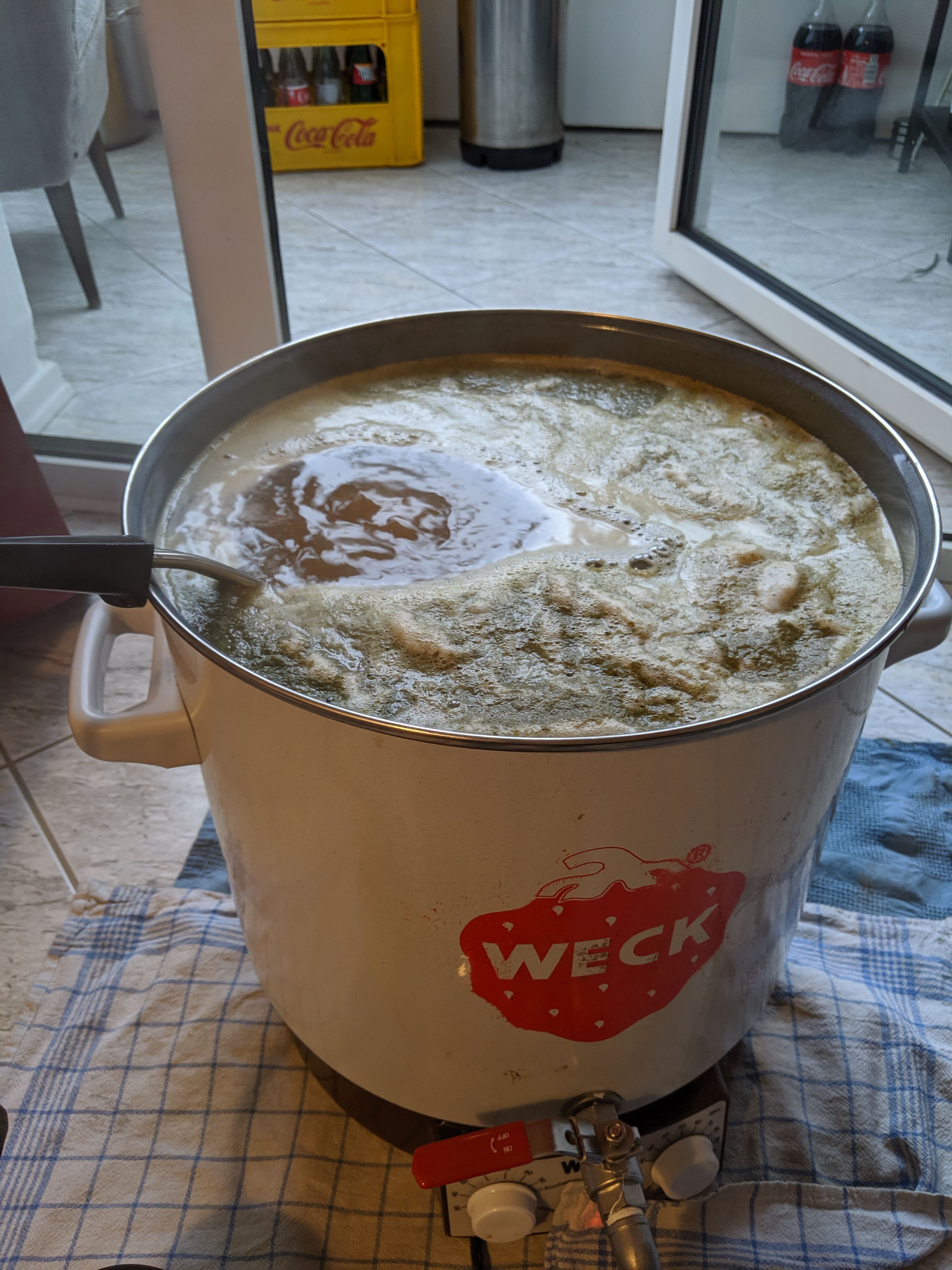 Die Stammwürze war bei Pfannenvoll 11,5 °P. Die Pfannen sind ein 29 L Einkocher und ein 25 L Contacto Topf. SHA also echt gut. Glattwasser hatte noch 4 °P. Kochen ging dank Tauchsieder und Powerfunktion des Herds (da steht der Contacto) wunderbar. Dann noch ein obligatorisches Foto von einer Hopfengabe. Den Cold Steep habe ich 10 Min vor Kochende gegeben.