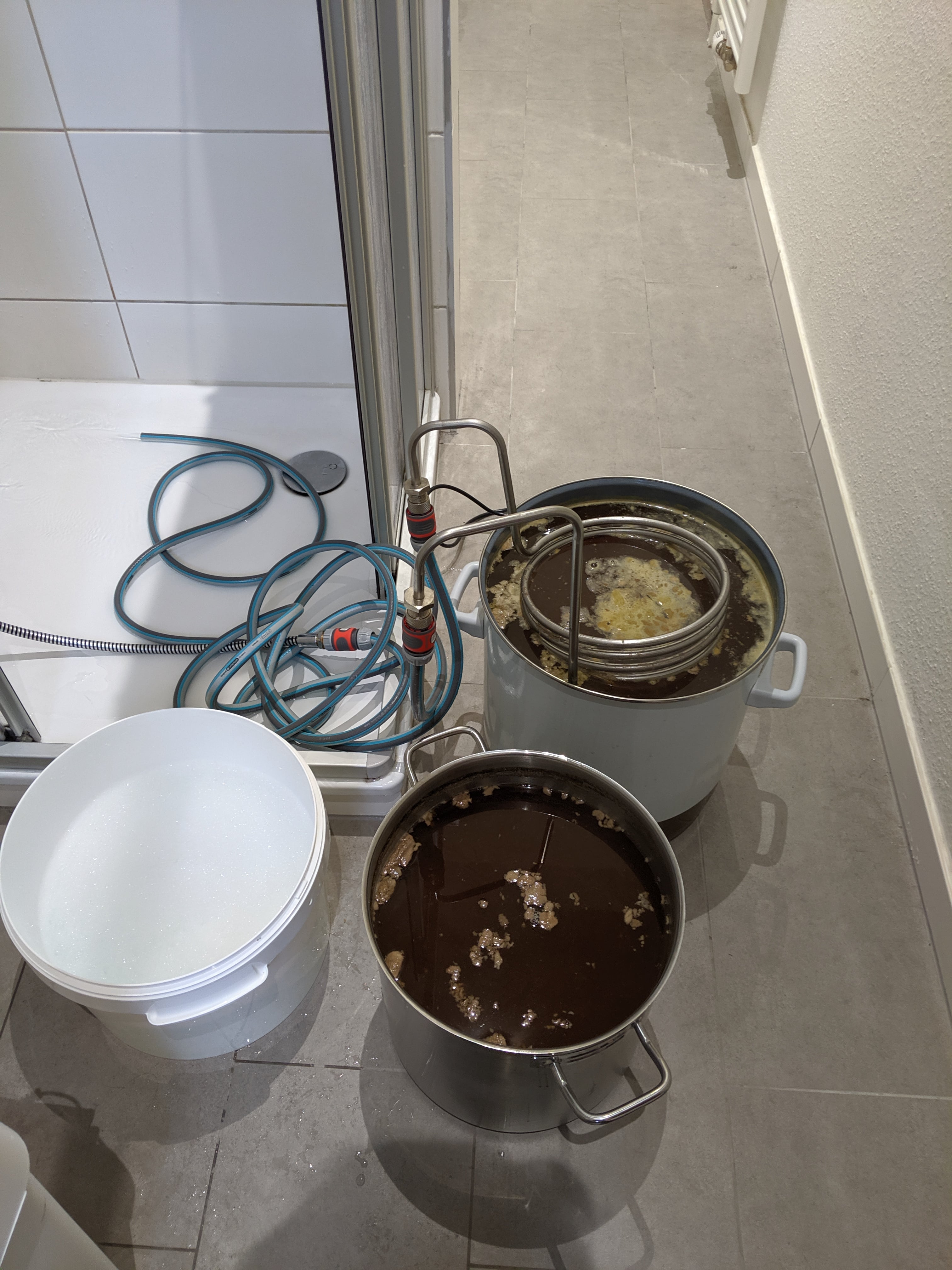 Das Läutern hat trotz Weizenmalz recht gut geklappt, aber ich mache mittlerweile auch Batch Sparge. Die große Schwierigkeit ist beim Doppelsud, das T-Stück mit den Silikonschläuchen in Waage zu halten, damit in beide Töpfe gleichviel fließt.