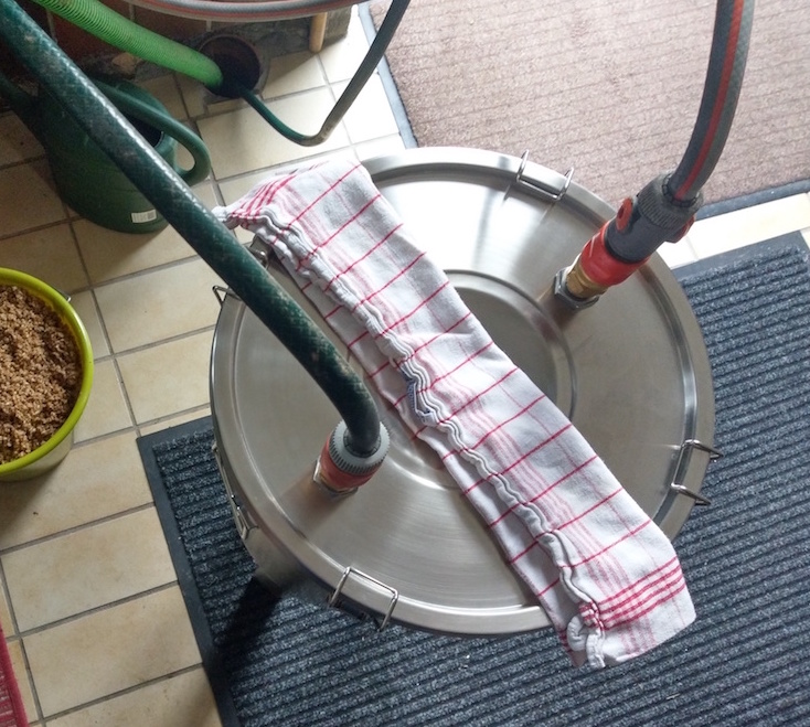 Durch die Kühlspirale passend zum Gäreimer ist das nun eine schnelle saubere Sache mit dem Abkühlen der Würze, und dank der Zisterne steht endlos kaltes Wasser zur Verfügung, das auch gleich wieder zurück geführt wird.