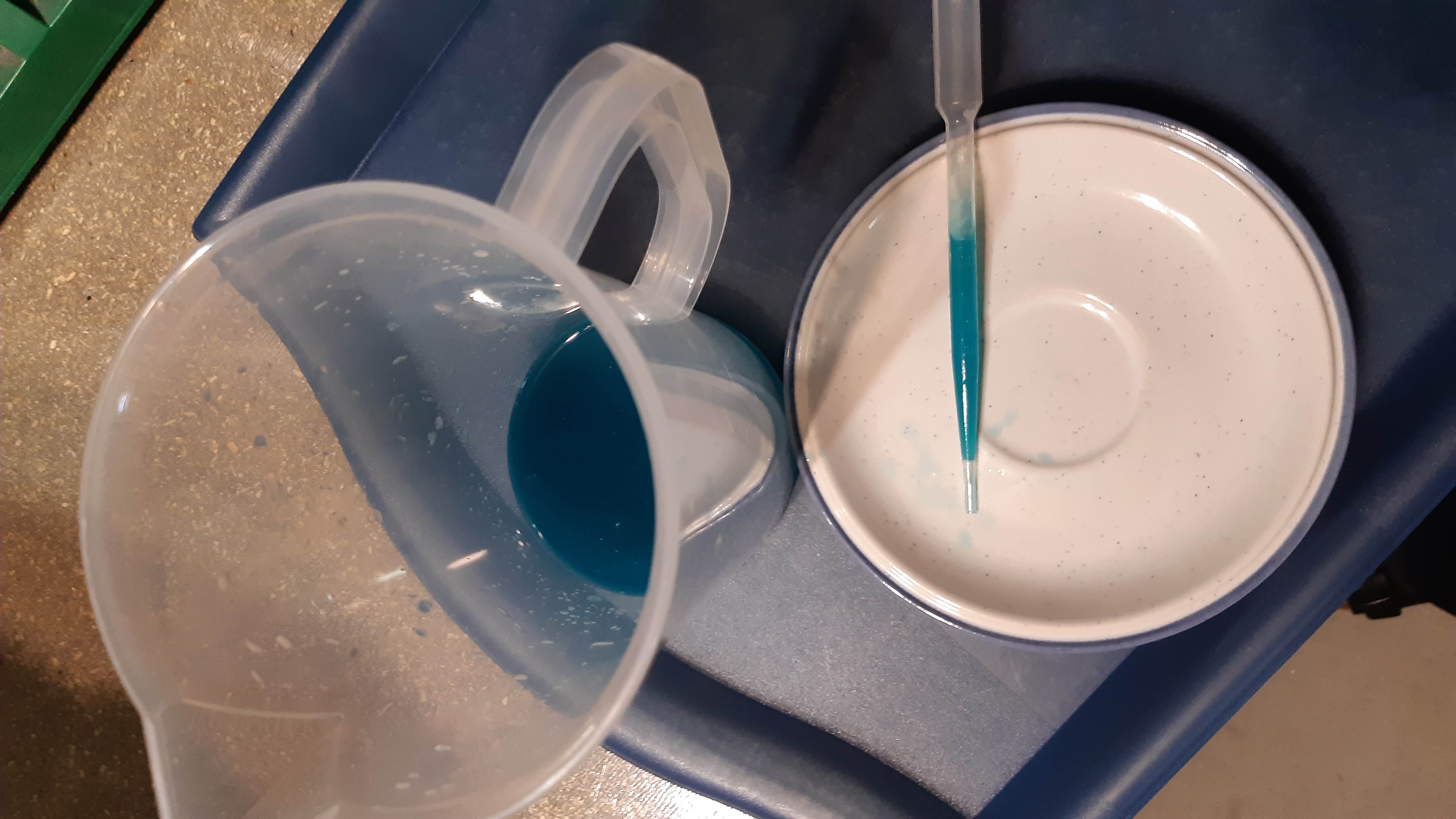 Nach Hopfenkochen, Filtern und Abkühlen auf < 30°C kam der Farbstoff zum Einsatz, Phycocyanin aus der Blaualge. Im Prinzip funktioniert der gut, ist allerdings nicht wirklich farbstark, so dass viel mehr Pulver nötig war als gedacht. Der gängige E133 Lebensmittelfarbstoff wäre die bessere Wahl gewesen.