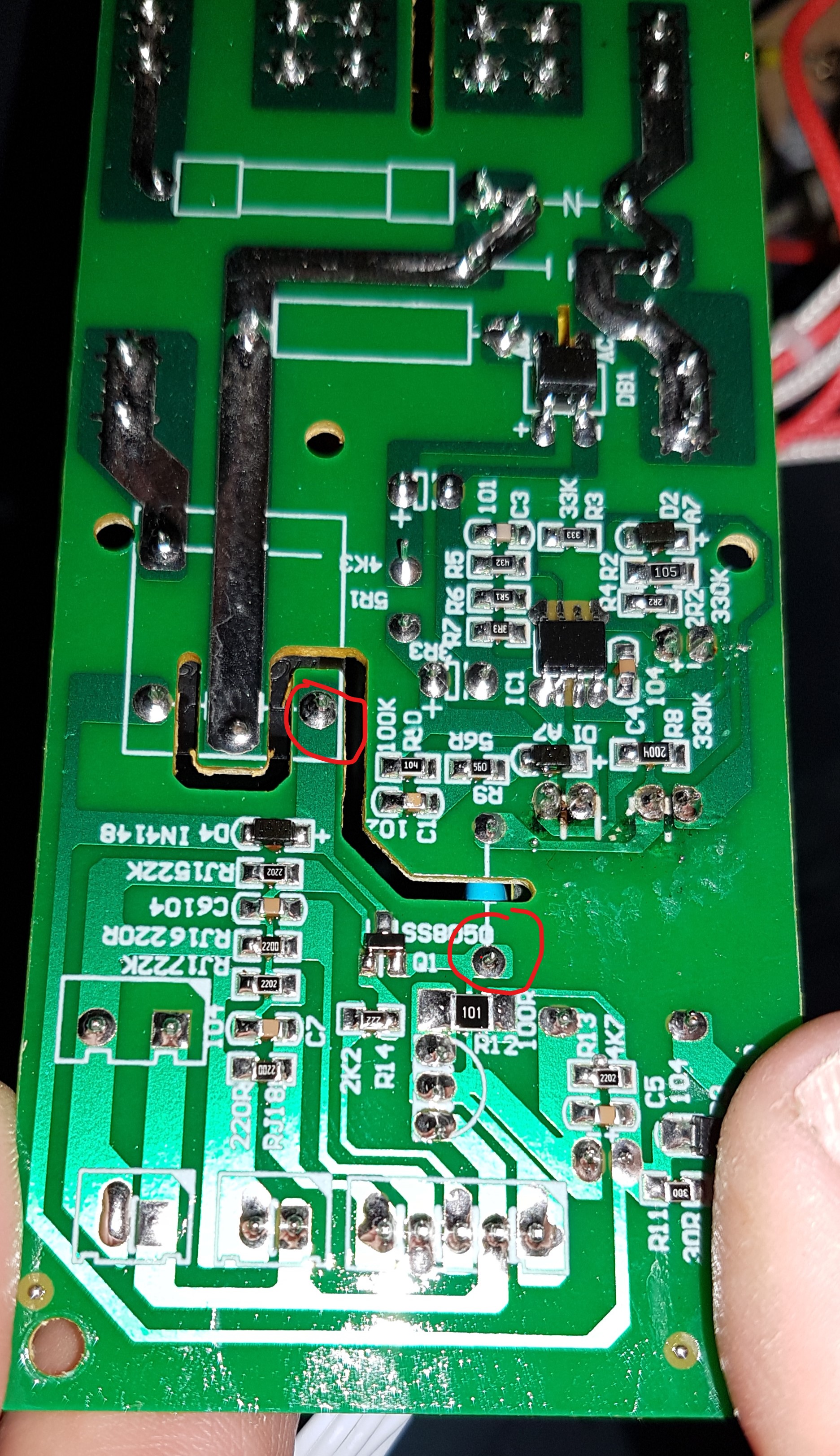 Ich hänge mich hier mal vorsichtig dran, weil ich gerade vor dem gleichen Problem stehe. Mein Einkocher ist zwar von Kesser, aber er hat die gleiche Platine, wie hier besprochen. Ich habe mal auf meinem Foto die beiden Punkte, die ich mir zur Brückung denken würde, rot eingekreist. Könnte das passen?