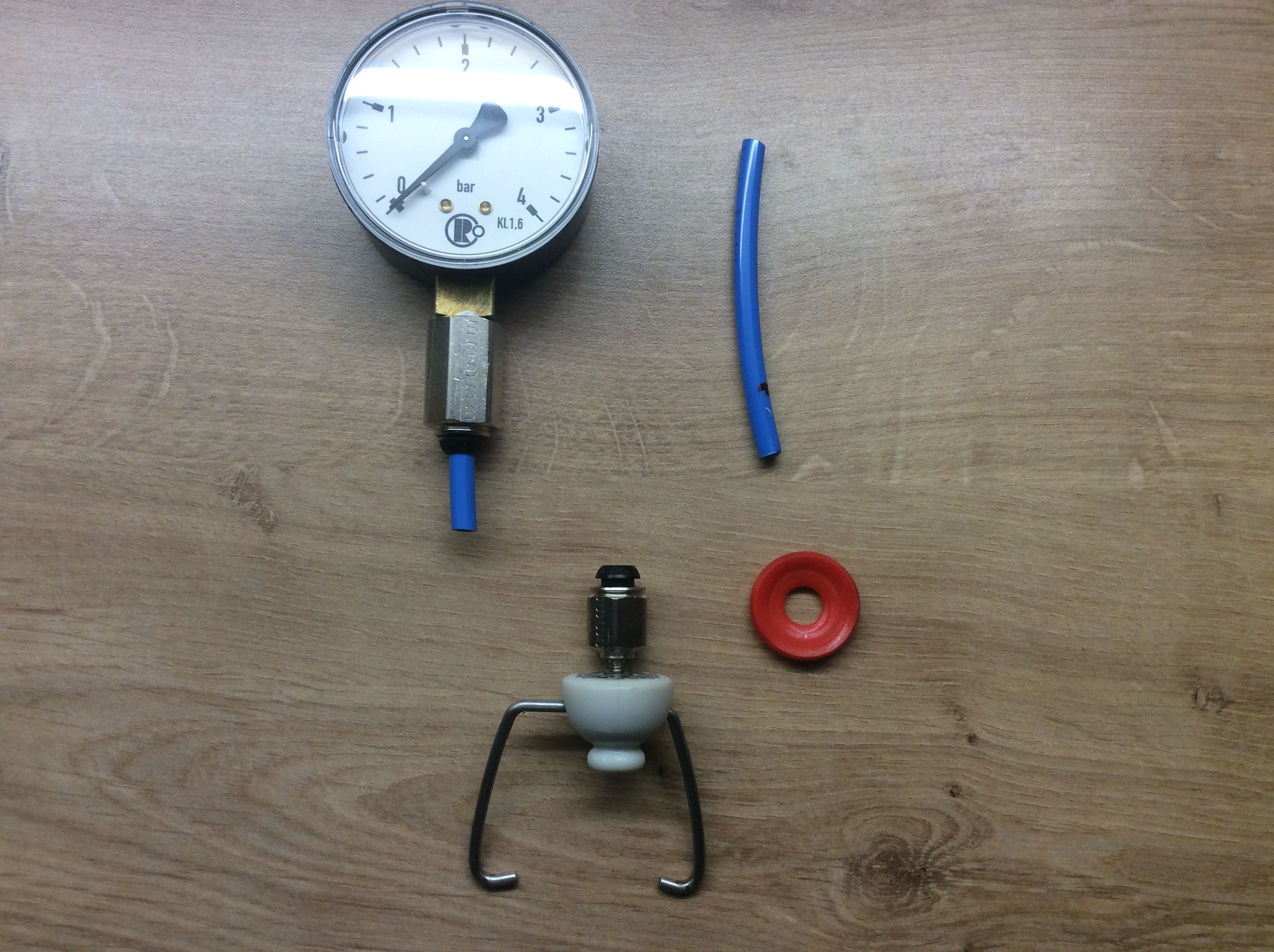 ich habe mir zahlreiche Anleitungen von selbstgebauten Flaschenmanometern im Netz angeschaut. Bin dann heute zum Fachhändler und habe mal rumgesucht. Ich wollte eine flexible Kupplung, auch um das Manometer zum Reinigen des Verschlusses abnehmen zu können. Das Ergebnis seht ihr unten. :) Die Verbindung ist ein Hartkunststoffschlauch und das System ist bis 10 Bar druckdicht. Der Schlauch lässt sich einfach abziehen.