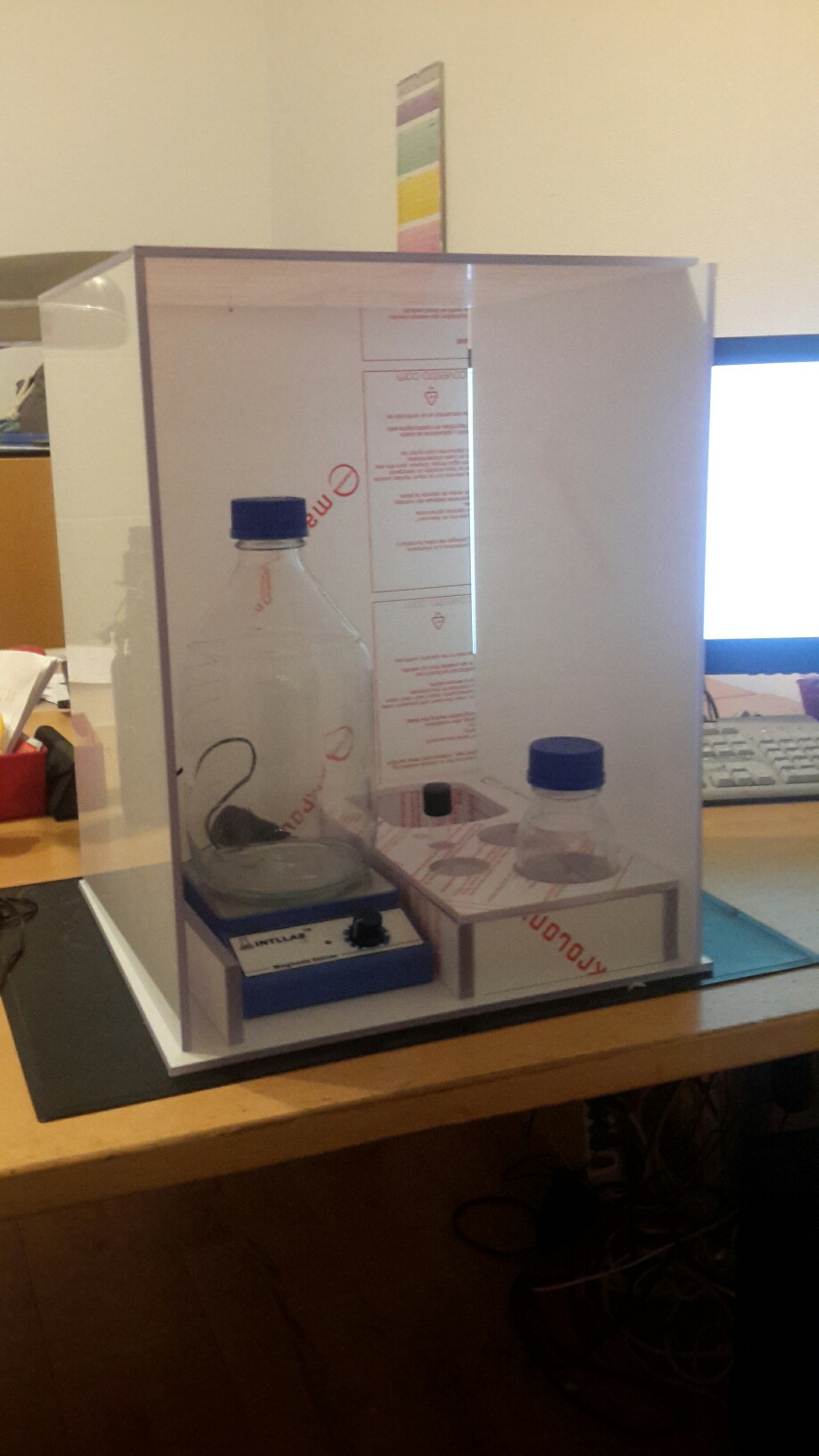 Das ist stark. Es soll also ein bisschen wie ein Laborabzug (fume hood) sein oder? Da kannst Du doch tatsächlich vielleicht noch einen größeren Lüfter verbauen (am besten in einem doppeltem Dach und noch besser mit einem Ansaugleit"blech" an der hinteren Wand damit es vom Boden her von hinten saugt) un Du hättest einen richtigen Abzug. Ein bisschen Luftzufuhr von unten oder über Filter vorausgesetzt. Zum Arbeiten dann lange Einstülphandschuhe und dann wäre es perfekt.