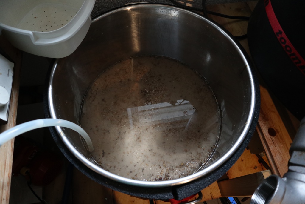 6.00 Uhr Leitungswasser ist auf 58°C gestiegen, nun wird eingemaischt 8:30 Uhr Maische ablassen und 20 min Läuteruhe 8:55 Läutern, dabei achte ich immer darauf das es immer 600-800ml pro min einstelle.