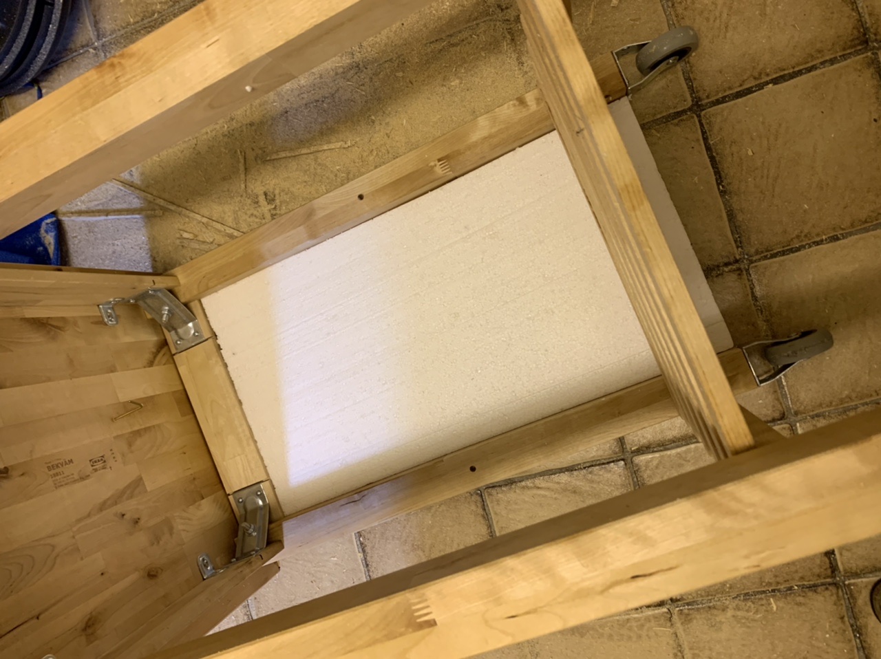 Für die obere Arbeitsfläche habe ich ebenfalls eine Dämmung zugeschnitten. Hierfür empfiehlt es sich, die Platte vom BEKVÄM abzunehmen, alles anzuzeichnen, zuzuschneiden und dann wieder festzuschrauben.