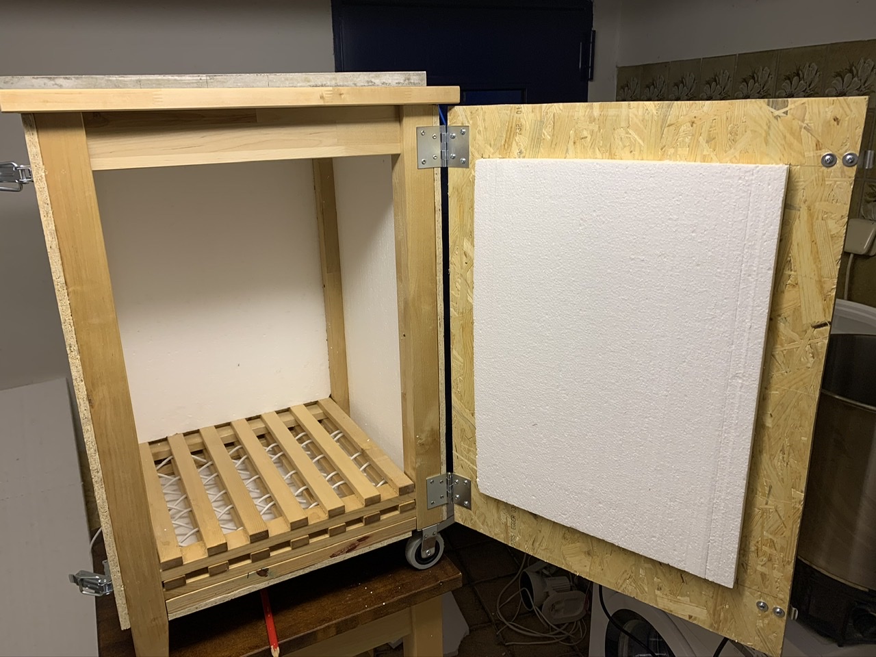 Fehlt noch eine Türe, damit man natürlich gut an den Gäreimer kommt. Hierzu habe ich eine passende Platte zugesagt und diese mit zwei Scharnieren befestigt. Auf der gegenüberliegenden Seite habe ich zwei Verschlüsse angebracht, um die Kiste relativ dicht verschließen zu können.