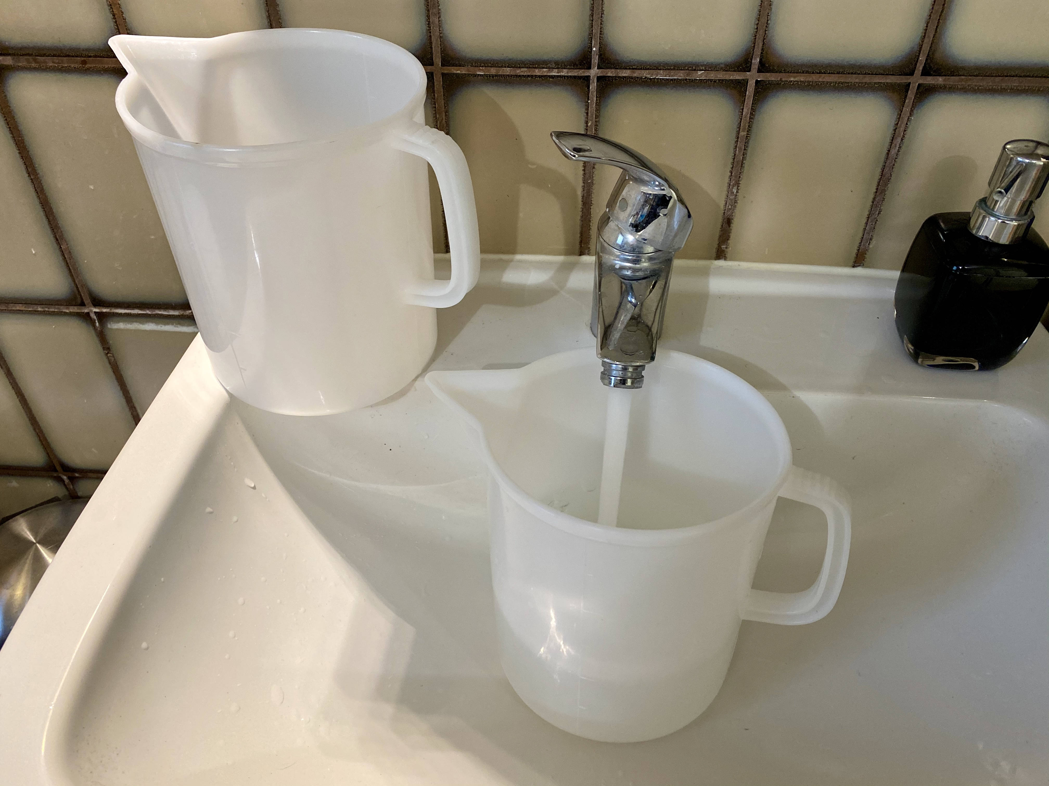 Danach ging es dann an das Schroten von Hand - bisher meine größte Schüttung. Schon beim Abwiegen wurde mir klar, dass es Zeit wird sich eine neue Waage zuzulegen: Zum Schroten ziehe ich der Mühle immer einen Gefrierbeutel über, damit es nicht so sehr staubt. Der Nachteil dabei ist natürlich, dass man ständig den Beutel ausleeren muss. Für meine bisherigen Schüttungen von ca. 3 kg war das aber immer ok: Nach ca. 20 Minuten war mir warm und das Malz bereit zum Einsatz: Aufgrund des Weizen-Anteils von 70% habe ich noch 5% Reishülsen untergemischt: Da ich keinen Wasser-Anschluss in meinem Braukeller habe, muss ich das Wasser in Messbechern zum Einsatzort transportieren. Mittlerweile klappt das ziemlich „fließend“ - sobald ich zurück im Badezimmer bin, ist der nächste Messbecher voll: Während das Wasser im Einkocher erhitzt wird bleibt mir ein wenig Zeit die Läuterhexe zu montieren. Weil sie beim 1. Versuch auch viel zu lang war, habe ich sie noch eingekürzt vorher: Dann ging es ans Einmaischen - ich habe das Volumen von Schüttung + Hauptguss leider vollkommen falsch eingeschätzt. Mein Plan war eigentlich die 2. Rast durch Zubrühen zu erreichen - da der Thermoport aber nun schon fast komplett voll war, hatte ich nun ca. 35 Minuten Zeit mir eine Alternative zu überlegen. Immerhin habe ich die Temperatur noch getroffen: Da ich mir gerade einen Tauchsieder zugelegt habe, kam mir letztlich der Gedanke die Maische damit auf die Temperatur für die nächste Rast zu erhöhen. Davon gibt es leider keine Fotos, da ich mit einer Hand das Thermometer und mit der anderen den Tauchsieder halten musste. Aber nun das Erfreuliche: nach ca. 20 Minuten hatte ich die Temperatur erreicht: Jetzt hatte ich Zeit, alles weitere vorzubereiten.