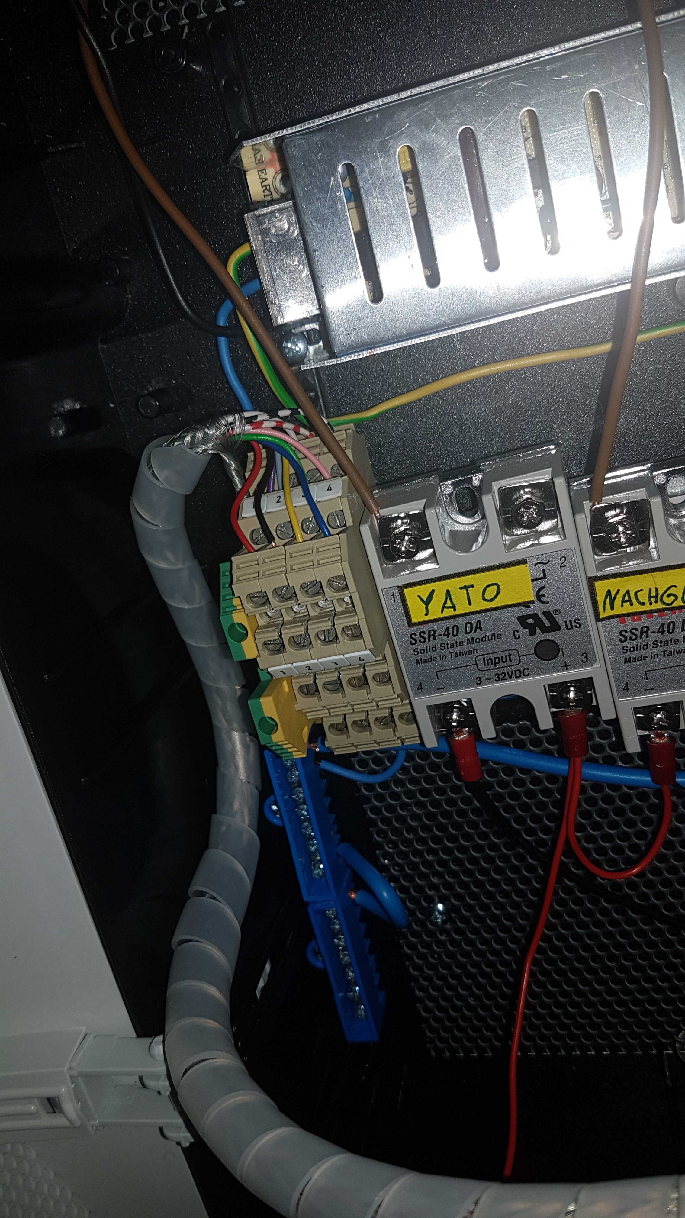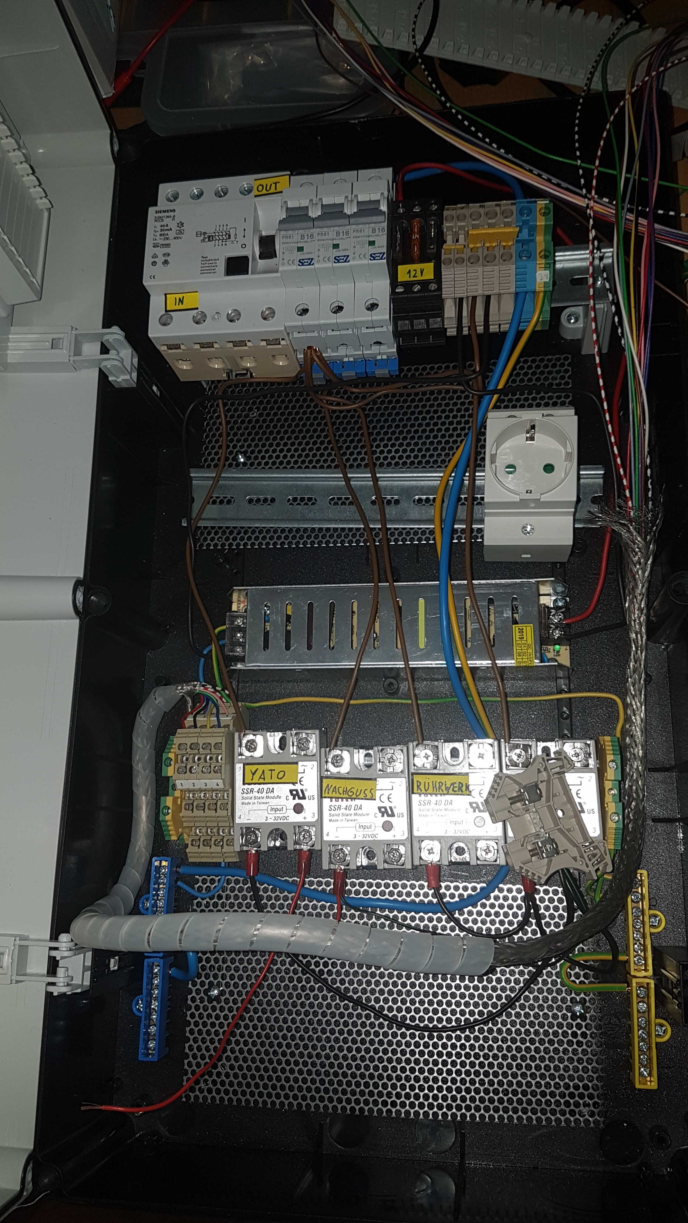 Schaltet das Induktionskochfeld ein, so fällt das Relais für den Nachguss ab. Der Schaltschrank lässt sich aber problemlos auf 3 Phasen Drehstrom umrüsten, sollte ich mal einen Keller mit 16A CEE Steckdose finden