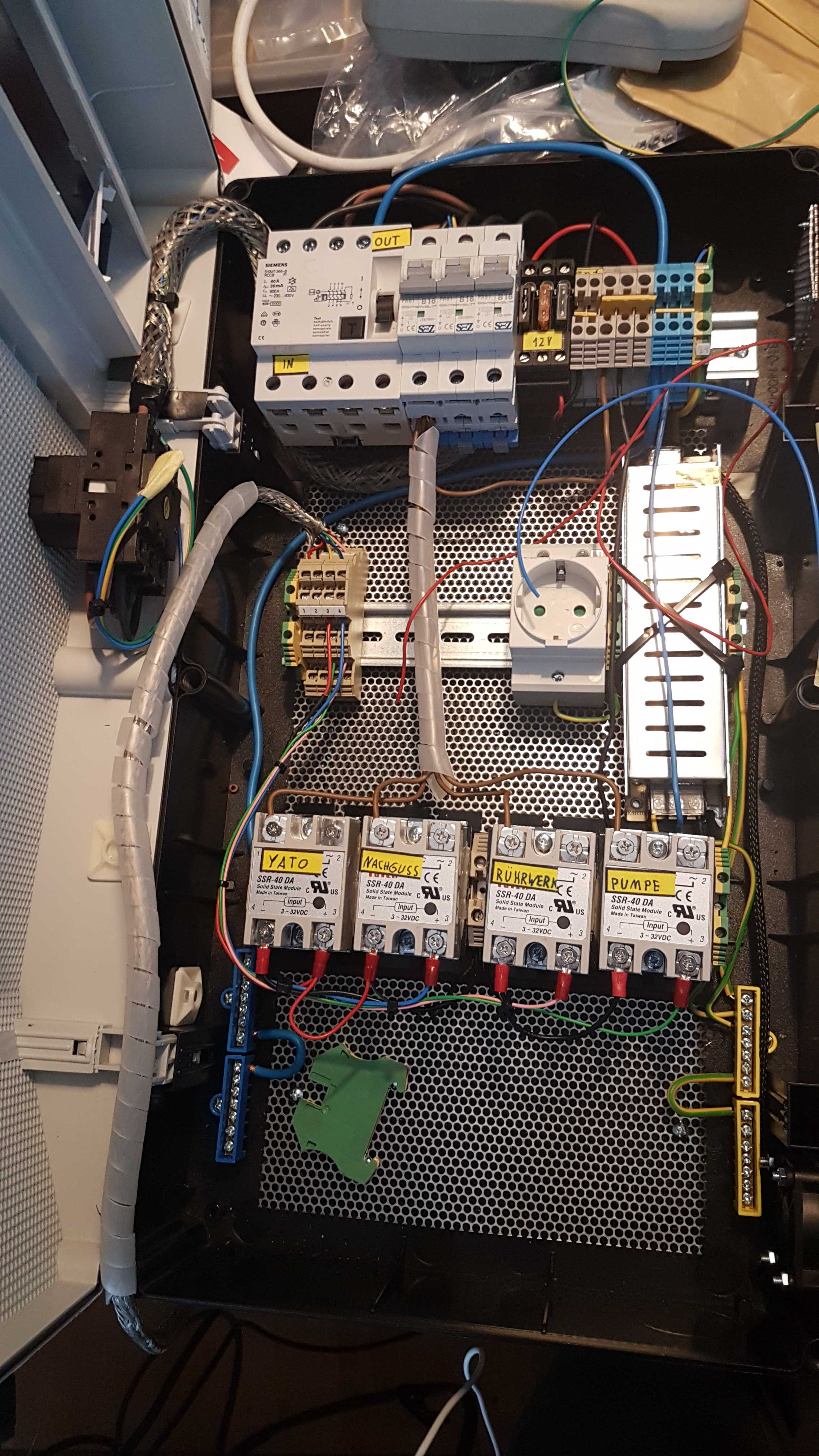 Schuko Steckdosen für: Yato, Nachguss, Rührwerk, Pumpe (wird irgendwann nachgerüstet) und für Peripherie wie Laptopnetzteil o.Ä.
