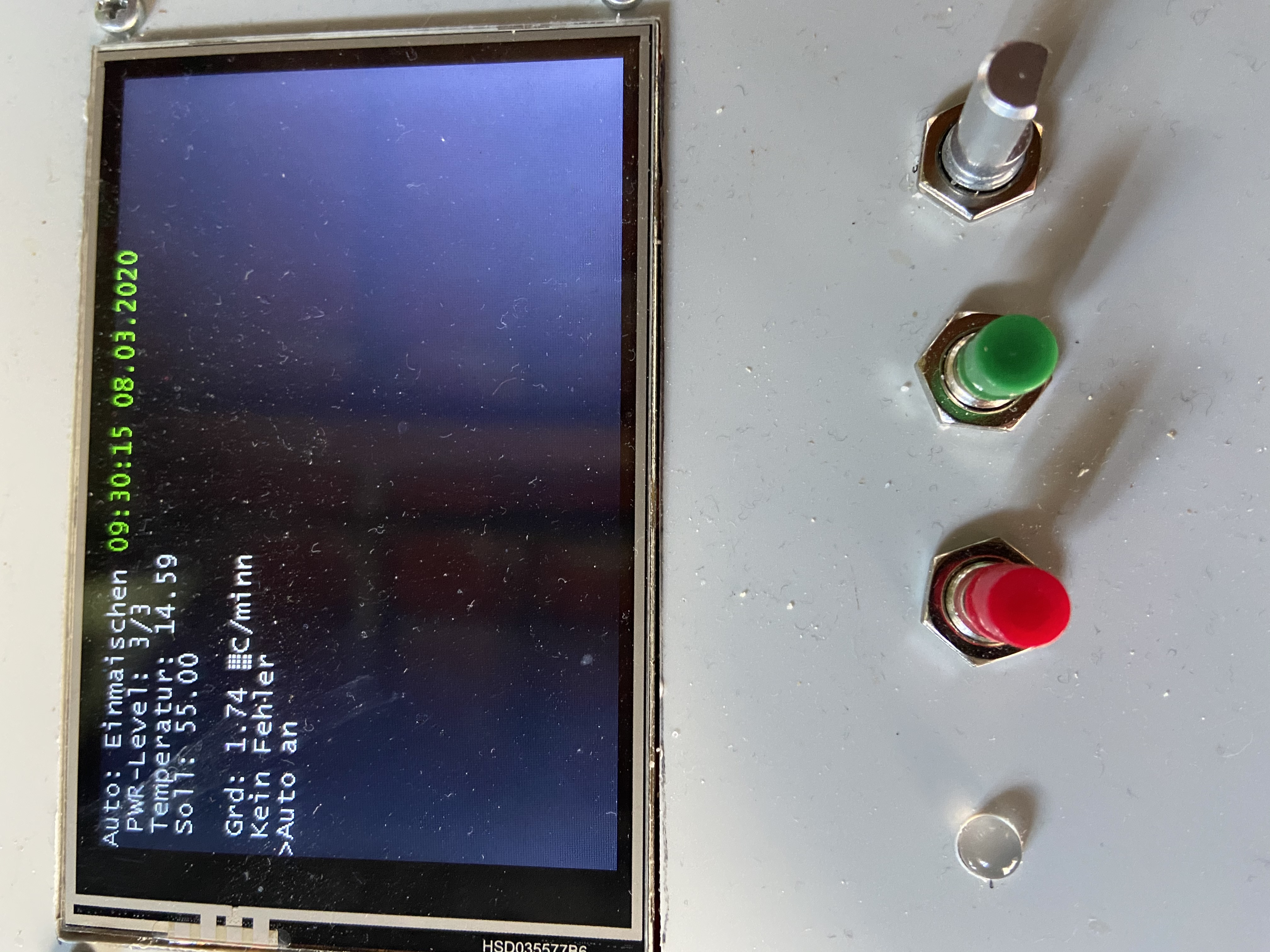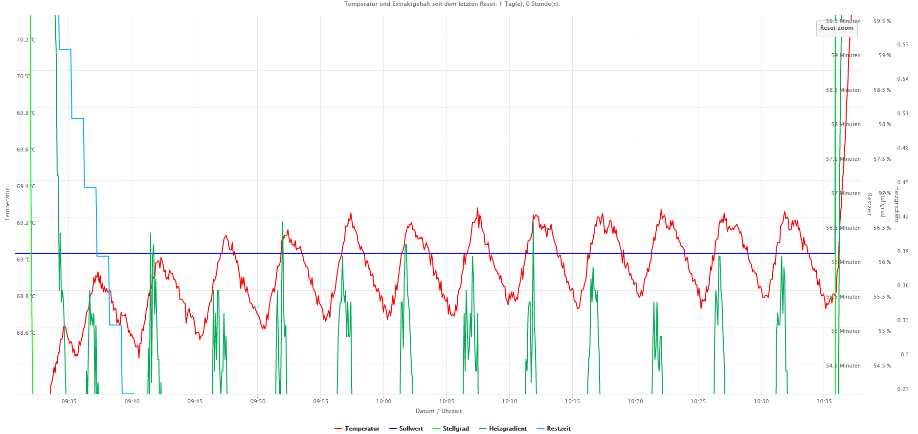 In der Steuerung wurde die neue Version 0.96b getestet bei die erste Rast erst nach Bestätigung nach der Zugabe des Malzes erfolgt. Leider war ein kleiner Bug in der Software der kurz behoben werden musste, daher gab es eine ungeplante kurze Rast von 8 Minuten bei 52 °C.