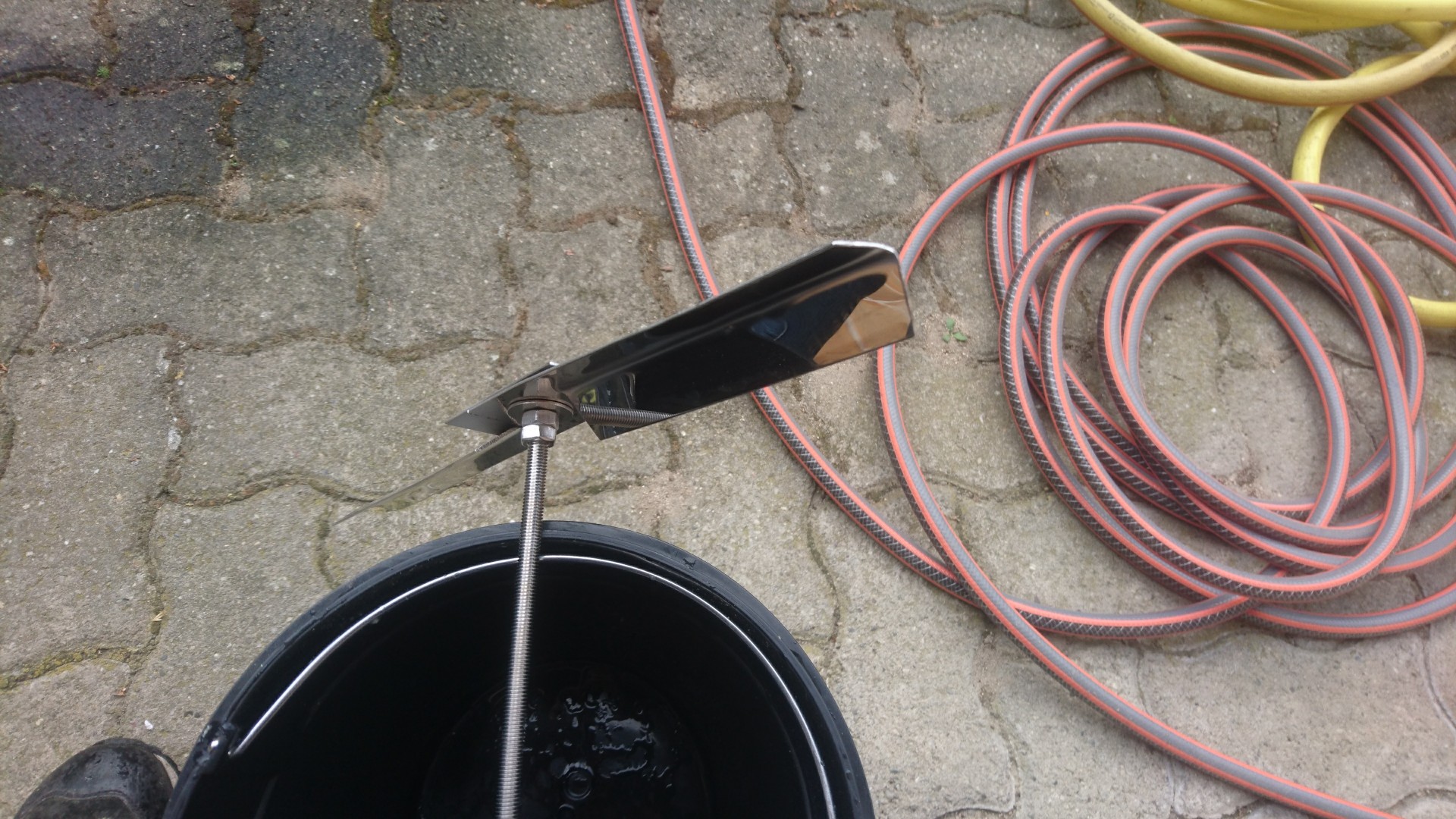 Ein Rührwerk musste auch her das haben ja fast alle hier und zudem habe ich am Anfang bestimmt genug anderes zu tun als zu rühren, vor allem da ich alleine brauen werde und deshalb keine Hilfe oder Arbeitsteilung zur Verfügung steht. Schwierig war das weniger, ein Scheibenwischermotor bei ebay bestellt auf eine Dreischichtplatte mittig geschraubt und an einer Edelstahlgewindestange ein Edelstahlblech das ich im Container in meiner Firma gefunden hatte zurecht gebogen, und mit Edelstahl Muttern fest geschraubt. Soweit so gut, leider dreht es falsch herum sprich wenn es rührt löst es sich... Passiert nichts so lange ich nicht mit dem Braupaddel darin hängen bleibe :Bigsmile