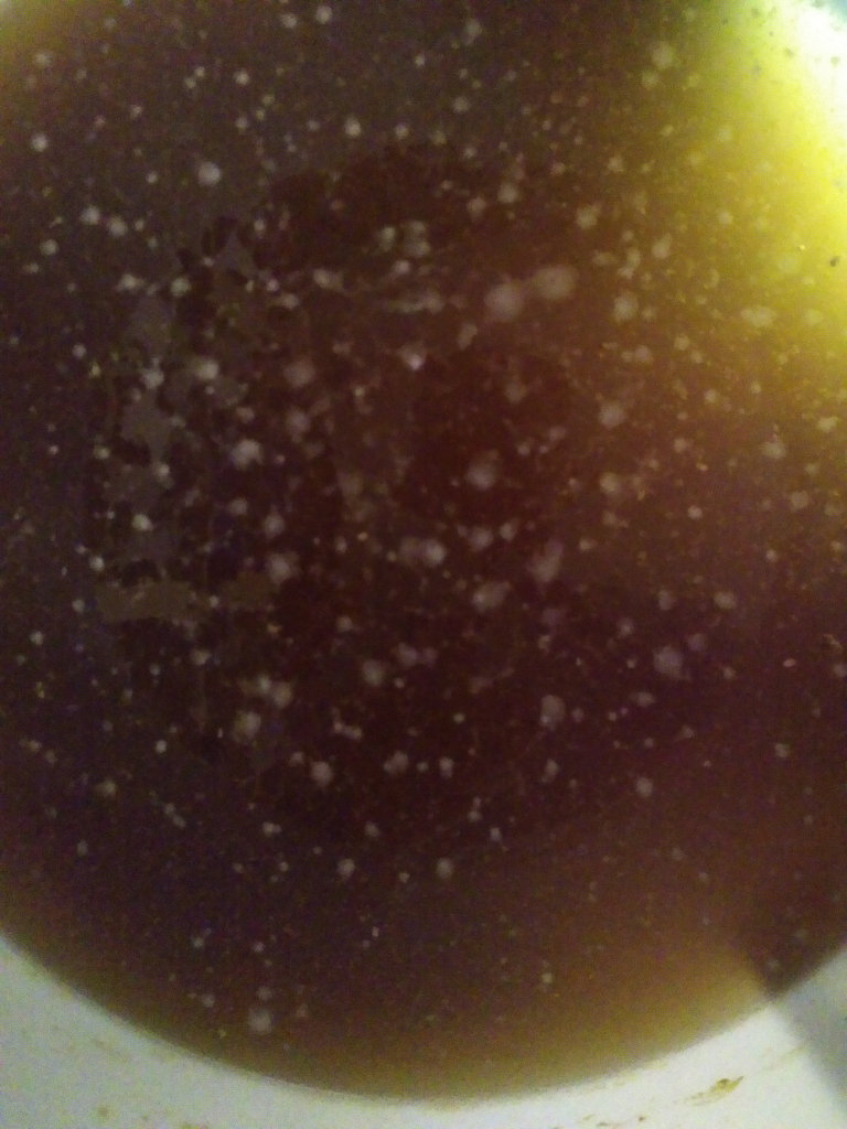 Ich hatte den Sud bereits gestern einmal belüftet. Als Ergebnis habe ich heute das vorgefunden... Für mich sieht das wie ein zaghafter Versuch der Hefe aus, doch noch ein wenig mitzuspielen. Werde die Hefe mal mit der Speise füttern.